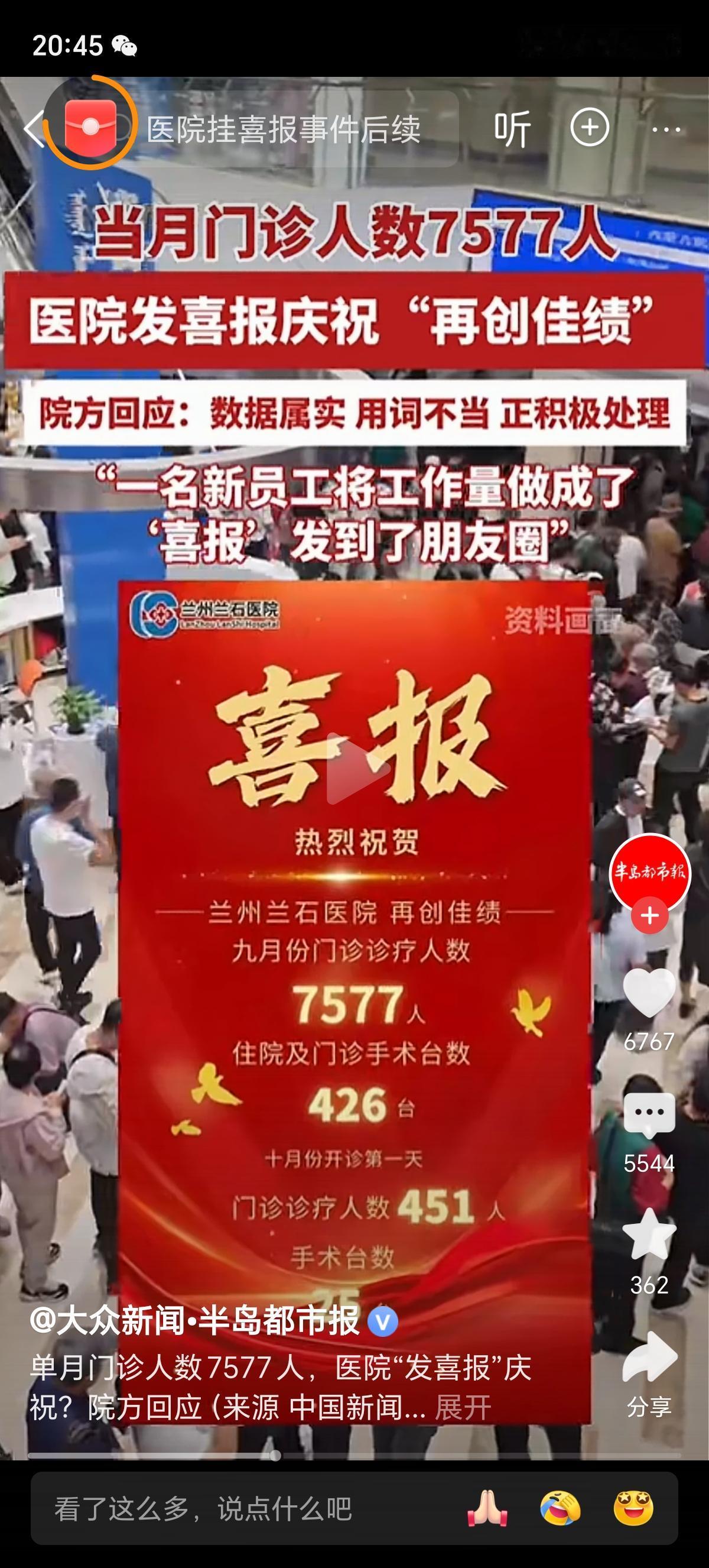 医院回应发喜报庆祝就诊人数创佳绩确实是喜报,对医院来说就是喜报,恭喜发财了都,就