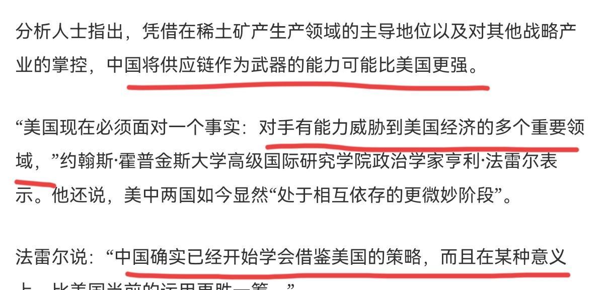 美媒出来说实话了!美媒表示,美国可能忽略了一个问题,那就是中国将供应链作为武器的能力比美国更强!10月16日,美媒刊文表示,中国政府通过旨在管控关键矿产流通的新规彰显了其在全球供应链中的影响力。美国现在必须面对一个事实:那就是对手有能力威胁到美国经济的多个重要领域。 凭借在稀土矿产生产领域的主导地位以及对其他战略产业的掌控,中国将供应链作为武器的能力可能比美国还更强。中国确实已经开始学会借鉴美国的策略,而且在某种意义上,比美国当前的运用更胜一筹。美国不得不承认的是,过去几个月的事态发展,使中国处于比特朗普第一任期时更强的谈判地位。 很显然,在美国威胁我们表示要对我们征收100%的关税之后,美国媒体出来说实话了。美媒传递的信息是什么呢?一句话,那就是美国不应该低估中国影响全球供应链的能力,甚至某种程度来说,中国在这方面比美国能力更强。现在的局面是美国的手段我们已经掌握,美国的制造业短时间内根本不可能绕过我们的稀土产业。 现在两个选项已经摆在了美国的面前,要么美国回到中美已有的共识上与我们谈判,要么美国升级冲突,但代价是美国做好多个领域被我们卡脖子的准备。很显然,美媒挑明这一情况,这其实也是提醒美国,不要对我们的能力出现误判。因为,如果误判情势,美国的代价将非常的惨重!