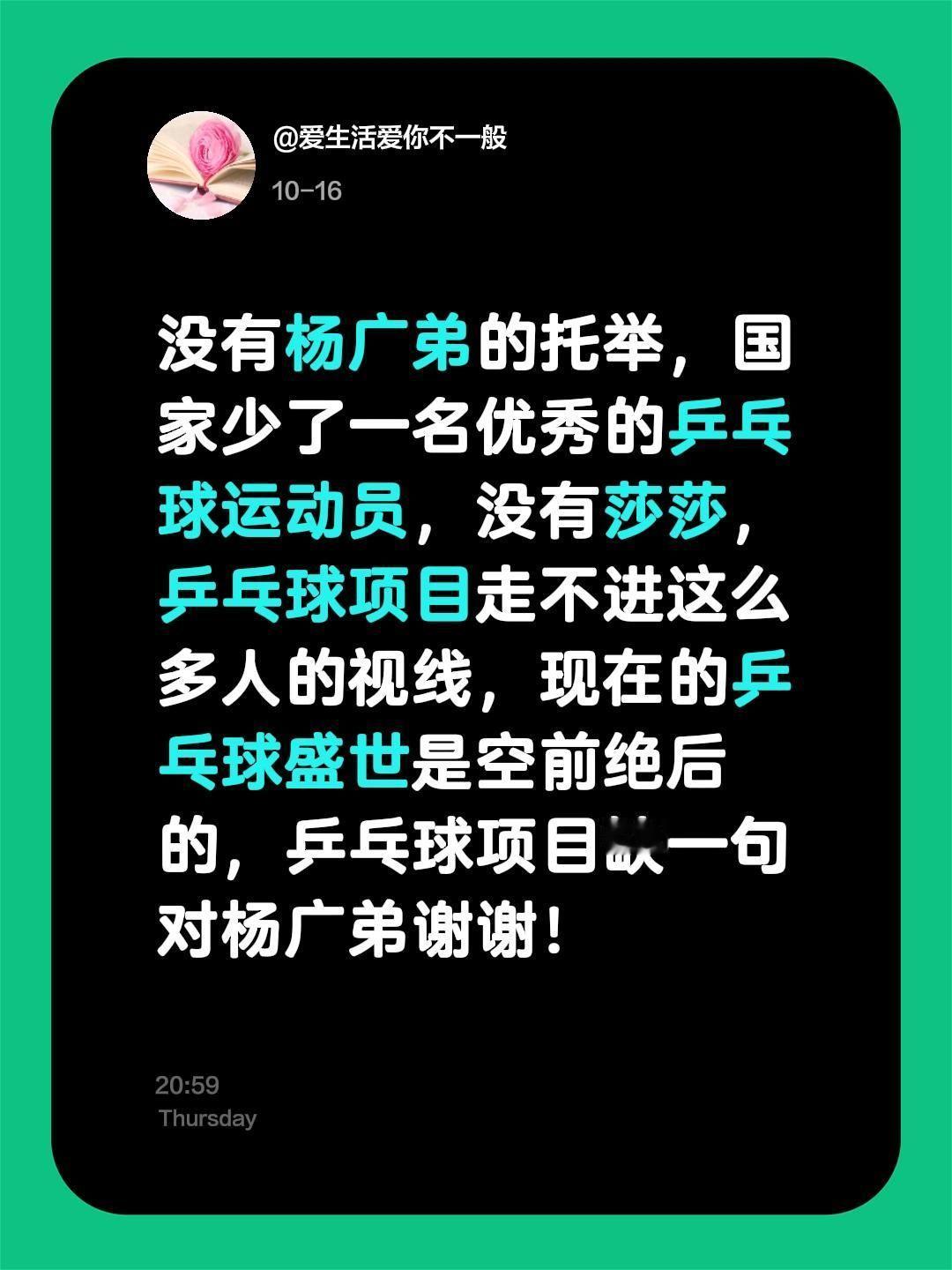 没有杨广弟的托举,国家少了一名优秀的乒乓球运动员,没有莎莎,乒乓球项目走不进这么多人的视线,现在的乒乓球盛世是空前绝后的,乒乓球项目缺一句对杨广弟谢谢!