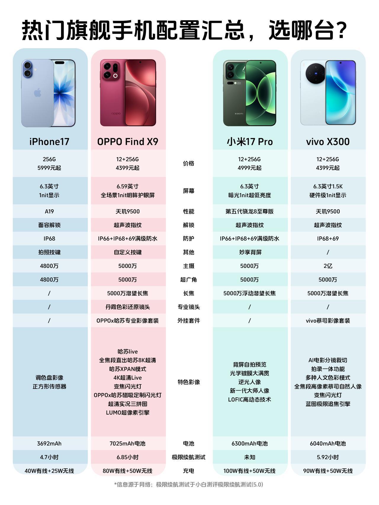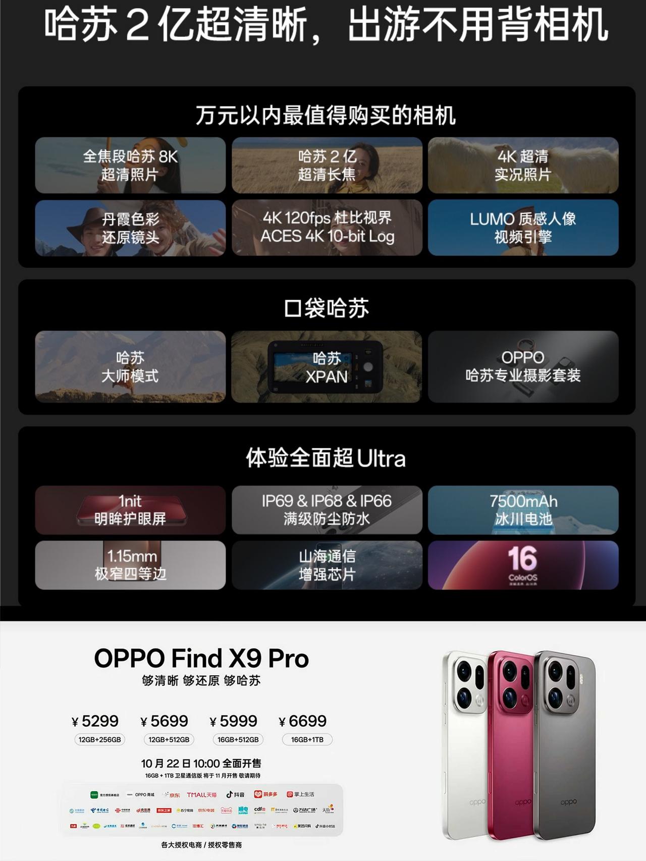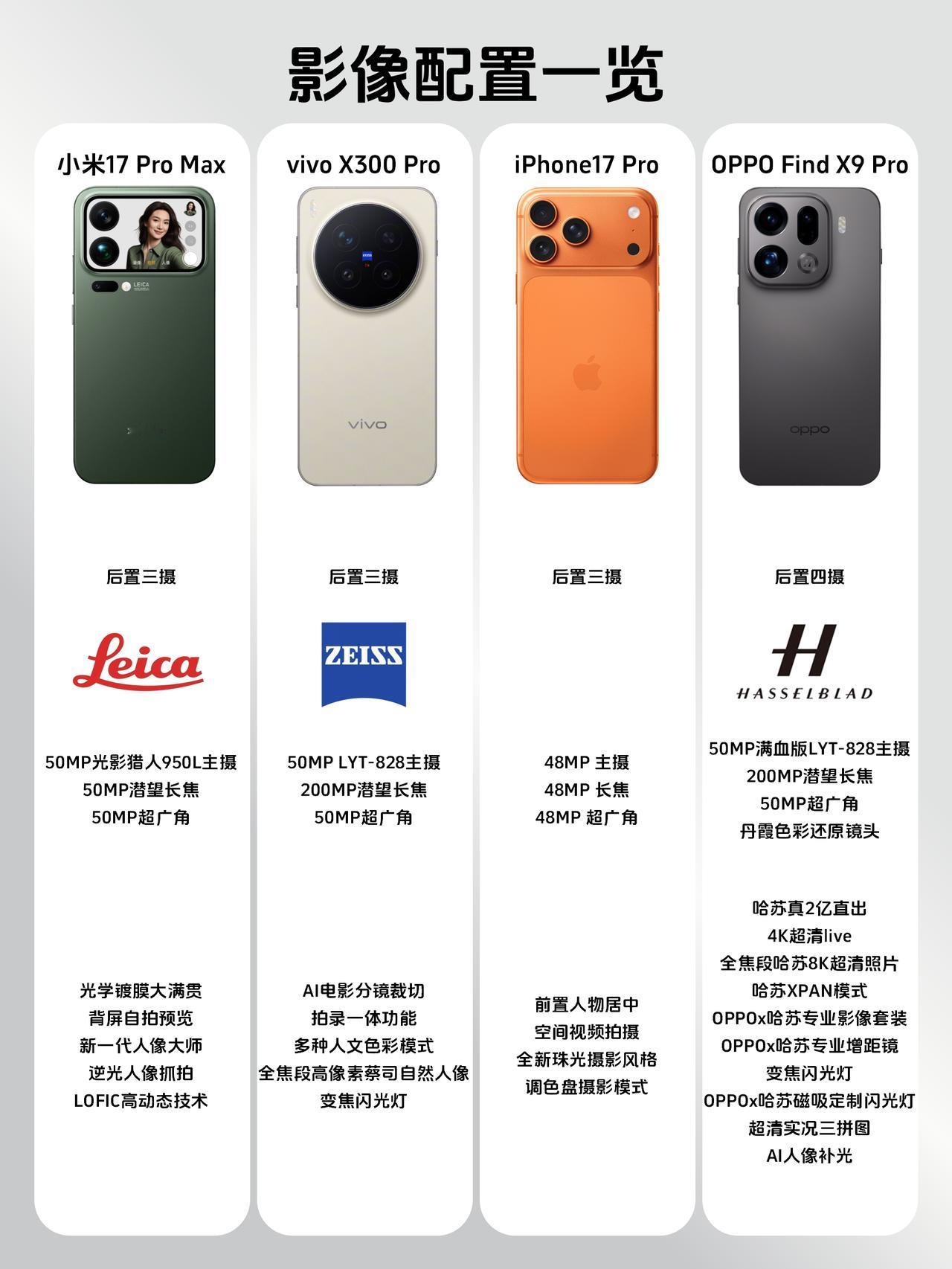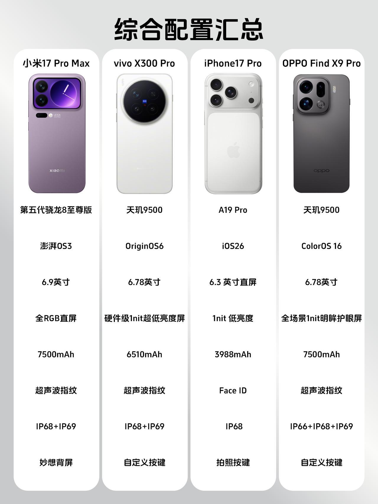 不演了,直接上!OPPO Find X9系列终于发布了,这次依然提供了标准版和Pro版两款机型,价格方面,Find X9起步价是4399元,Find X9 Pro起步价是5299元,这价格大家还满意吗? 关键是这回新机的亮点不少,我们来简单汇总一下: 1、外观: Find X9系列外观大改,背面采用了左上角矩形Deco设计,简约大方,而且还用上了一体冷雕工艺,质感直接拉满。这回还提供了多种配色,尤其喜欢Find X9 Pro这个追光红,还用了绒砂工艺,手感和质感看起来不错,颜值这块狠狠拿捏! 2、影像: 拍照依然是OPPO的拿手好戏,这回全系都配备了潜望长焦+丹霞色彩还原镜头+哈苏,这在同价位里比较少见,无论是拍人像还是望远,画质都更扎实,色彩还原也相当优秀,支持8K哈苏超清照片、4K Live图实况。而且Pro版还用上了哈苏真2亿长焦,加上全新的哈苏影像套装以及增距镜,演唱会山顶位都能出片!主摄还是瞬时三曝版的LYT-828传感器,表现相当强劲。 3、性能: 搭载了天玑9500旗舰处理器,OPPO调校靠谱,性能属于当前的第一梯队,应对日常使用和大型游戏都没什么压力。 4、系统: 出厂搭载了全新的ColorOS 16,三大引擎加持下系统流畅度进一步优化,妥妥的“机圈新德芙”,用起来会更省心。而且UI方面还用上了全新升级的光场设计,搭配无缝架构实现全场景动效无缝衔接,APP切换丝滑跟手,对上iOS26也不输。AI功能也是更进一步,AI一键闪记功能刚拿到吉尼斯纪录,AI实景对话也像步步高点读机一样,哪里不懂点哪里就能解答,而且还能跟苹果手机、手表、耳机互联,相当实用。 5、其他配置: 全系搭载全场景1nit明眸护眼屏,还是极窄四等边,护眼效果+视觉效果都拉满;续航方面,标准版给到7025mAh电池,Pro版更是有7500mAh,同期旗舰里都没这么大手笔的,续航相当哇塞,还有3D超声波指纹、IP69满级防水,基本无短板。 简单总结: X9标准版是一款实力均衡的“中杯旗舰”,而X9 Pro则在影像、屏幕等核心体验上更是做到了全面顶格,可以满足不同需求、不同预算消费者的需求~ 至于大家问的下半年这几款中杯旗舰该怎么选?我也汇总了表格,大家可以从四款旗舰的不同点选择,主要看自己的需求。 如果你追求均衡的影像体验,对续航有高要求,想要没啥短板的全能机,OPPO Find X9的吸引力更大; 如果你更喜欢苹果的质感和iOS,预算也充足,iPhone17自然是首选; 如果你特别偏爱拍人像,并且看重手机的轻薄时尚,蓝厂会是你的菜; 如果你对手机的性能、影像有高要求,还想要可玩性更高的手机体验,有背屏的粮厂也不错。 总的来说,这几款机型各有侧重,个人是更看好新鲜出炉的OPPO Find X9系列,不仅续航、影像体验突出,还能同时保持出色的手感、质感,配色也很好看。今年的市场竞争确实很激烈,对消费者来说是件好事,不知道你更看好哪一款呢? IPhone小米vivo手机发布会OPPO Find X9