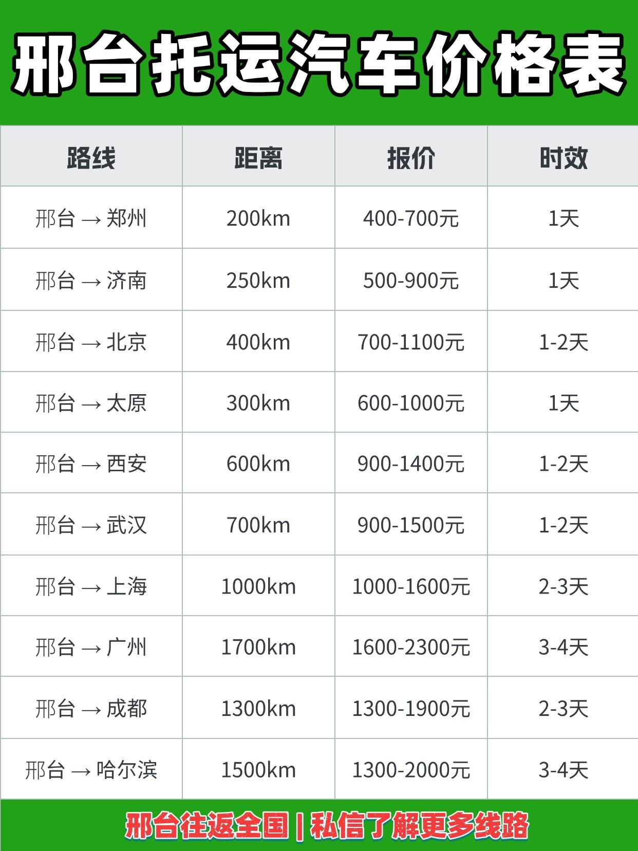 📢 邢台发全国报价区间 ✅ 短途(500km内):1500-2500元 ✅ 中途(500-1500km):2500-4500元 ✅ 长途(1500km以上):4500-6000元 ⚠️ 西藏/新疆等偏远地区:7000元+ ⏱️ 时效参考:500km/天,如遇天气/节假日顺延。 🛡️ 运输保险怎么收? 🌟 必含基础险!公司免费投保车辆价15万(保额≈车值)。 🔺 高价值车辆(超15万部分):按**0.3‰**补差价! 例:30万的车补缴:(30-15)×0.0003=45元 📝 签合同前确认保单,避免扯皮! 📍邢台发车点在哪? ➡️ 市区集中点: 邢台高开区物流园(中兴大街东段) 4S店合作点(比亚迪/大众等门店可代收车) 市区指定停车场(信都区钢铁路北) 火车站附近集散中心(方便外地车主交接) 🔔 提前1天预约,师傅上门取车or自驾送车都OK!