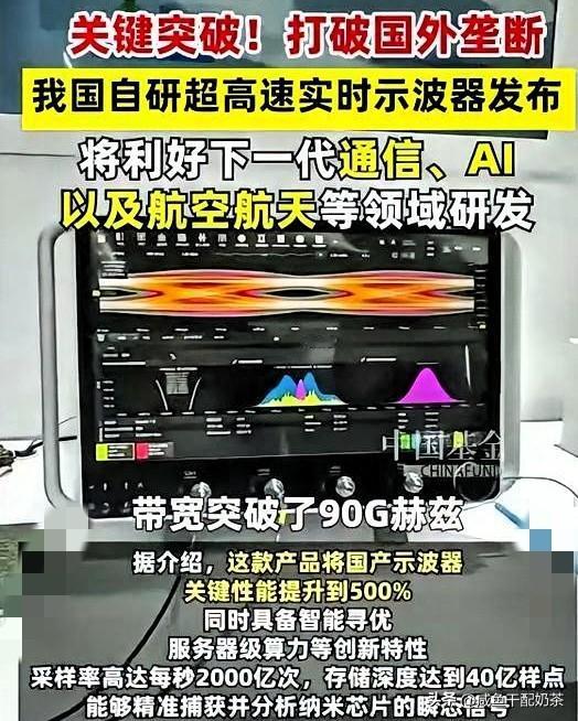 打破国际巨头垄断, 万里眼示波器发布破封锁, 国产示波器突围记:西方禁运60G带宽,咱们一步步追上震惊突破!在西方国家通过瓦森纳协议禁止60G带宽示波器出口给某中国之后,很多人以为在这方面中国已经落后于世界水平了。 然而在2023年, 普源精电DS80000系列数字示波器(最高13GHz模拟带宽)就已经问世了。2024年7月,玖锦科技守仁系列20GHz高速数字实时示波器及其他高精尖测试仪器也将在国际测试测量仪器领域大展宏图。 而如今2025年10月, 万里眼发布一款带宽高达90GHz的高速实时示波器,它将跃居全球第二,仅次于德科技110GHz实验室级产品。 从13GHz到90GHz, 这步子迈得是真扎实,西方的封锁反而逼出了咱们的硬实力。要知道高端示波器可是芯片研发的“眼睛”,以前想买好的都没门。 咱玖锦、万里眼这些企业一点没含糊, 不光追得上,还能做出20GHz、90GHz的产品,说明咱们在核心技术上不是光喊口号,是真刀真枪在突破。 现在离全球第一的110GHz就差一步了,照这个速度,说不定用不了多久,咱们就能从“跟跑”变成“领跑”,让西方看看啥叫中国速度。 这事儿也给咱们提了个醒, 核心技术靠买是买不来的,别人一卡就慌了。只有自己掌握技术,才能在国际上硬气起来,国产示波器的突围就是最好的例子。 总结 以前西方说不卖给咱就不卖给咱,现在咱自己能造90GHz的,这波反杀太解气,技术硬才是真底气。从13GHz到90GHz,每一步都很不容易,为这些搞技术的人员和企业点赞,这才是中国企业该有的样子。