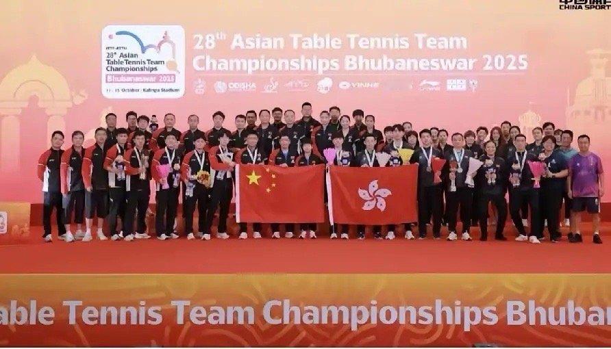 画面里,中国国旗与中国香港区旗相伴,冠军国乒与亚军中国香港队选手紧挨,满是“一家亲”的温暖。