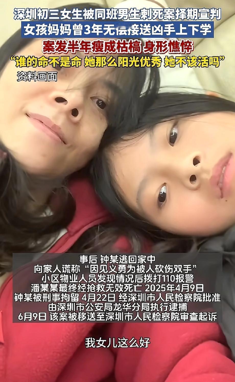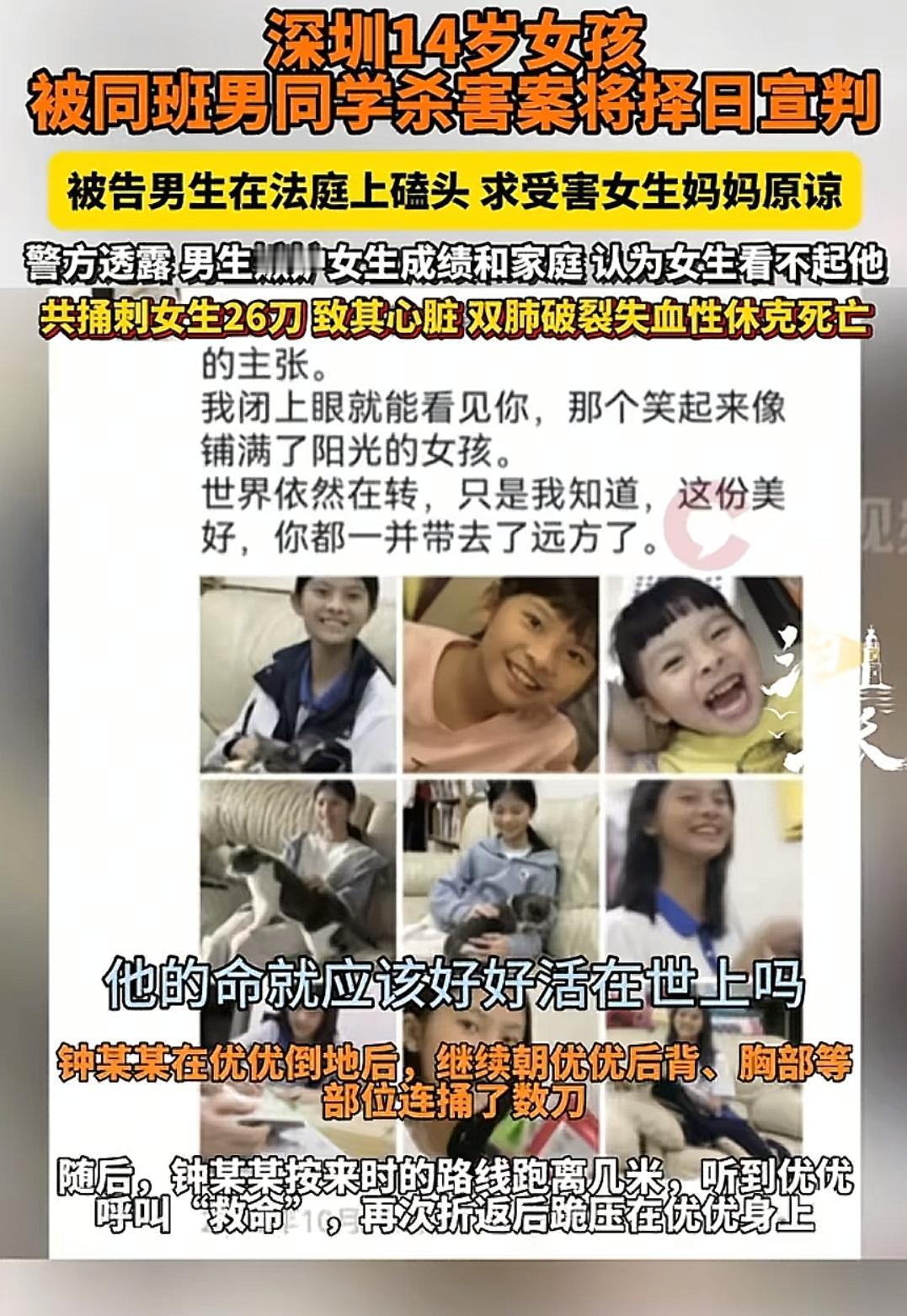 深圳遇害女孩的爸爸,今年48,夜里得搂着闺女的衣服才能合眼。庭审他不敢去,他十分后悔。那天他只把女儿和那个恶魔送到小区门口,就掉头走了。要是他再陪孩子上楼,也许一切就不会发生。 而优优的妈妈也是哭得声嘶力竭,她说往常女儿放学的那段时间,她都会在楼上去眺望。 而事发那天她并没有眺望,如果自己去窗户那么看了,大喊一句你在干嘛?钟某是不是就不会对女儿下手了? 听见这些话我真的很难过,但是我想告诉叔叔阿姨,这不是你们的错误!你们也不知道钟某是这样的人,而且凶手已经有了这样的打算,哪怕那天不下手,他总会作案的。 所以希望你们不要再折磨自己了,这一切都怪钟某,你们并没有错,现在就是等着法律去制裁他! 我们都相信正义一定会来临的!