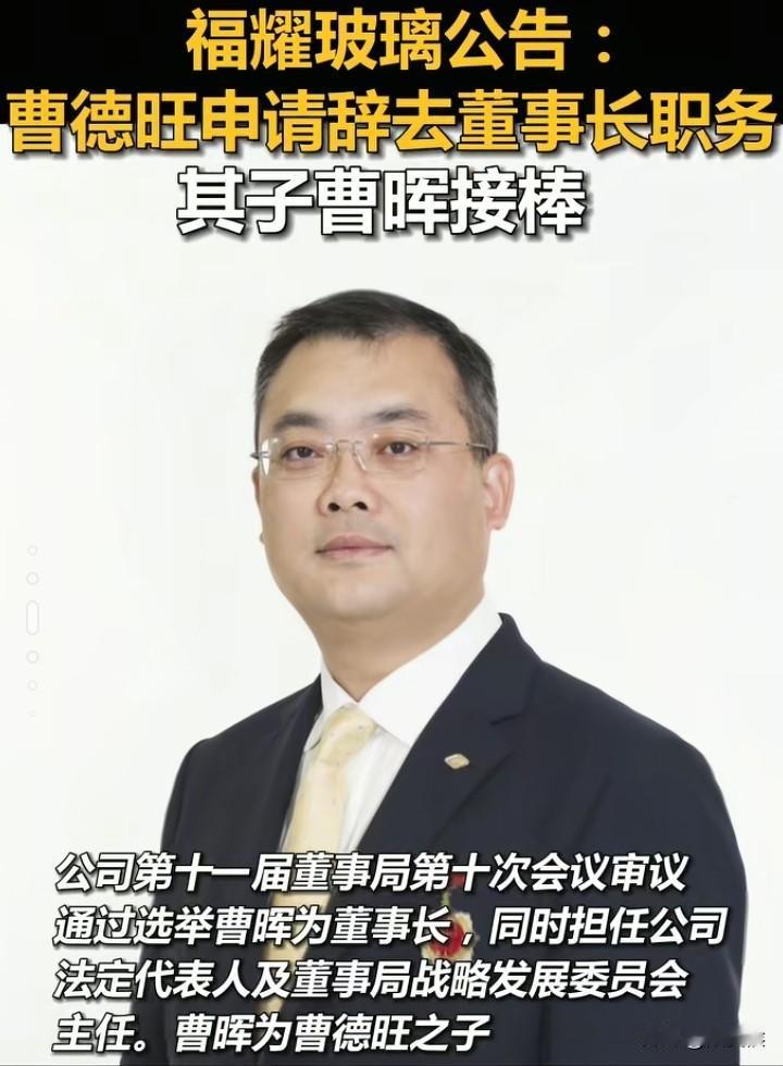 现在全国最糟心的男人就是叶舒了 被当成“太子”培养了很多年,一觉醒来,岳父把接班人换了,自己居然成了“废太子”,要扶持亲儿子上位了。 10月16日,福耀玻璃发布公告公司董事长曹德旺,因推动公司治理结构战略性优化和可持续发展的需要辞去董事长职务,但将继续担任公司董事及部分子公司的董事、董事长和法定代表人职务。公司选举曹晖为新任董事长,并任命其为法定代表人及董事局战略发展委员会主任。 曹德旺趁着自己身体还好,对公司还有掌控力,把接班人给换了,把培养多年的女婿换成了自己的亲儿子。 可怜的叶舒,被当成接班人培养了这么多年,眼看着多年媳妇就熬成婆了,结果就没有结果了。 都说一个女婿半个儿,但那也只是半个儿,还是没有自己儿子亲啊,这点曹德旺心里还是分的清楚的。 看来曹德旺也是吸取了娃哈哈的教训,生前交班,以免身后乱战成为一锅粥。 就是可怜了女婿叶舒啦。