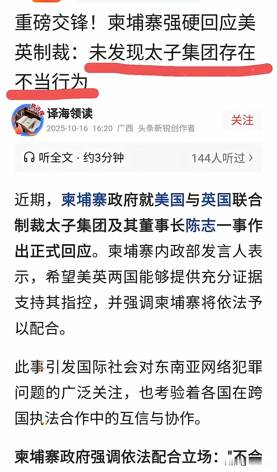 柬政府终于出来站台,以国家名义力撑诈骗集团,令人大开眼界毛骨悚然。 美英都拿出实锤了——太子集团陈志每天狂赚3000万美元,10个电诈园区里全是被胁迫的受害者,连150亿美元比特币赃款都追回来了,可柬政府还在硬要“证据”。说白了就是揣着明白装糊涂,上百亿赃款撑起的利益链,从保护费到项目分红,早把各方绑在了一起。 所谓的“国家站台”,其实是穷国对短期暴利的妥协。明明知道电诈园区藏污纳垢,却睁一只眼闭一只眼,直到骗到美英头上收不了场。美英的铁腕打击,戳破的不只是诈骗集团,更是这种“靠恶赚钱”的畸形生存法则。 利益面前,监管很容易失守,但真能靠纵容恶行当长久出路吗?你觉得柬埔寨最后会真心配合追查吗?