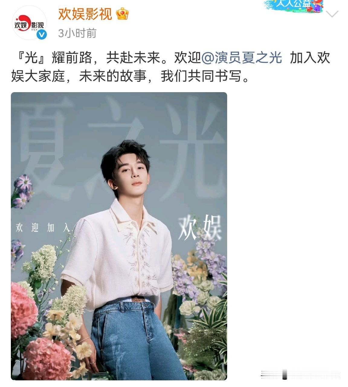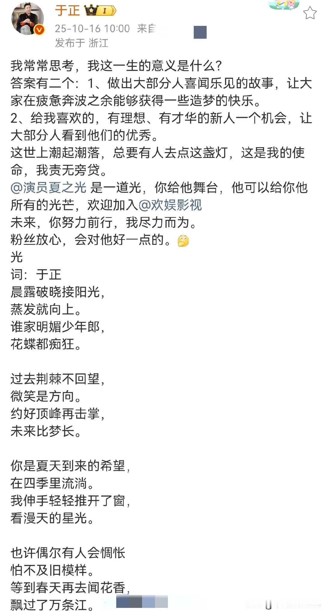 10月16日,前X玖少年团成员夏之光官宣加盟欢娱影视。老板于正专门发文祝贺,他还