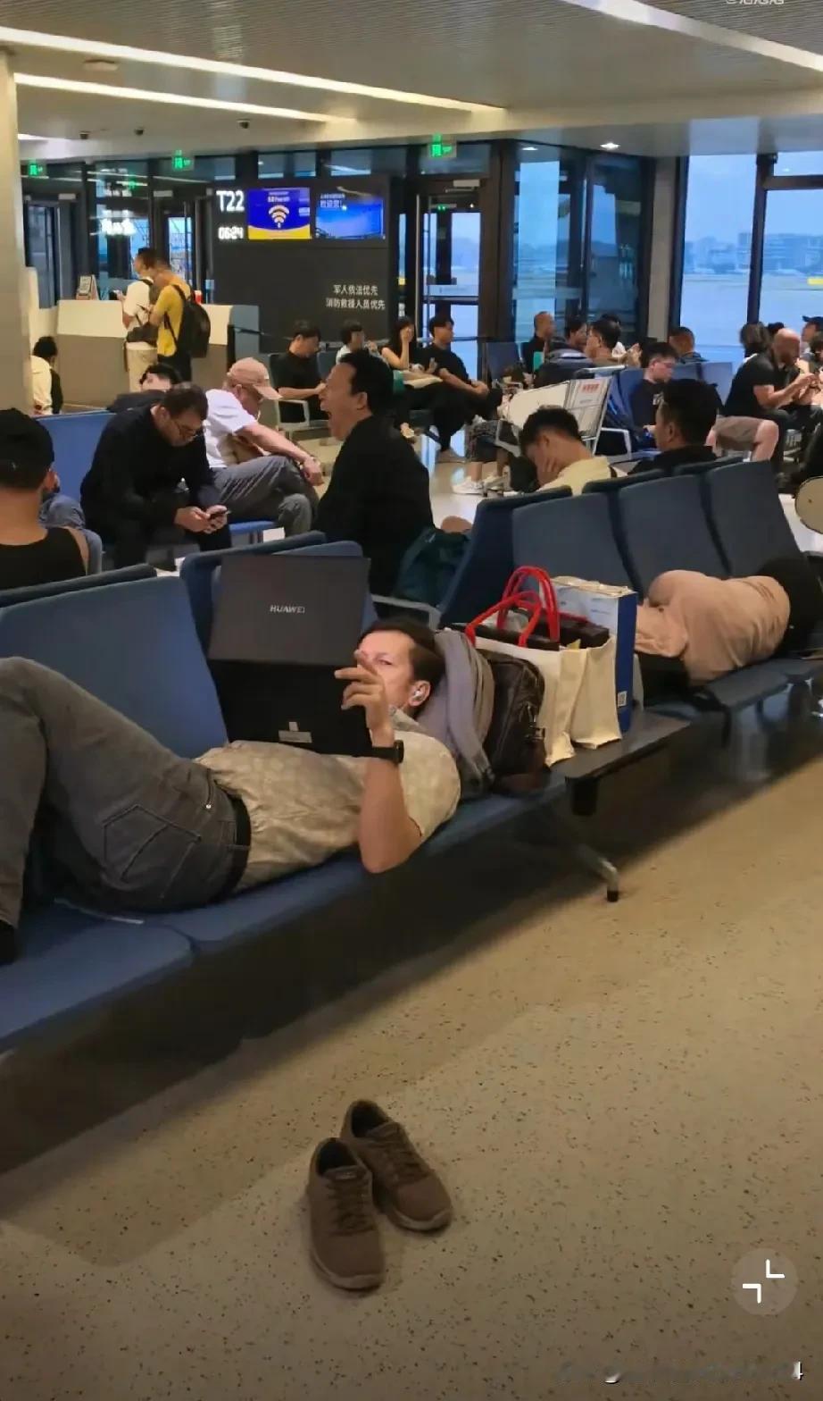 今天刷到一视频,在上海虹桥机场,有两个外国人躺在并排的椅子上,占了六个位置。有人