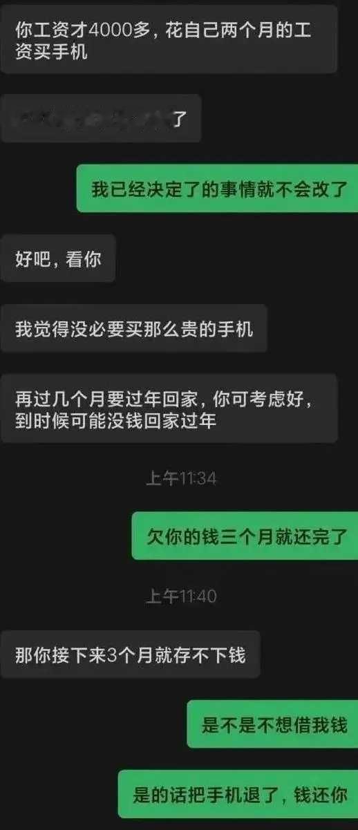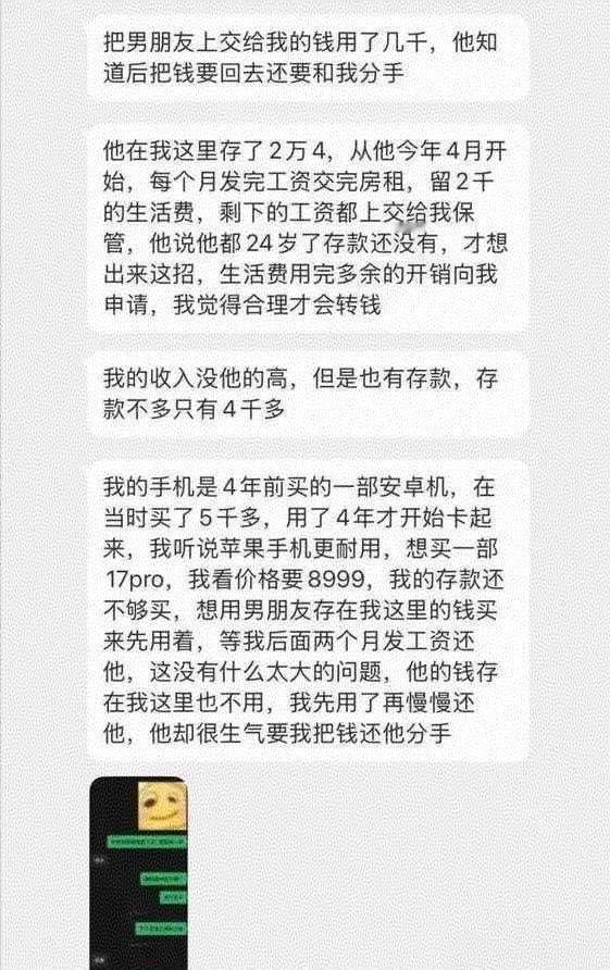 存款2.4万花5千买手机!情侣撕破脸,网友:分对了 “上班闲着,老板白养我啊?”男生一句冷言,浇灭了女友缓和关系的心思。这场争吵的导火索,是一部8999元的苹果17 Pro。 24岁的男生自4月起便将工资交女友保管,扣完房租和2000元生活费后,共攒下2.4万元。没曾想,女友擅自从中取走5000元,加上自己的四千多元购入新手机,还计划用他未来两个月的工资补窟窿。 “保管不是随便支配!”男生震怒,要求退还剩余1.9万,否则分手。他直言四千多的手机够用,得留钱过年。女生态度强硬:“就想买能用五六年的,你就是不想帮我”,认为钱在自己手里“急需可先花”。 沟通彻底降温,男生回复只剩冷淡的“随便”。消费观与边界感的巨大分歧,让两人彻底对立。 网友几乎一边倒支持男生:“没结婚就动三分之一存款,太没边界感”“男生理性靠谱,消费观不合早分早好”。 法律层面,此类情况属保管合同纠纷,保管人无权擅自支配财物。这场闹剧戳破真相:感情经不住“理所当然”的消耗,恋爱可感性,花钱需理性,边界感才是关系的保护盾。