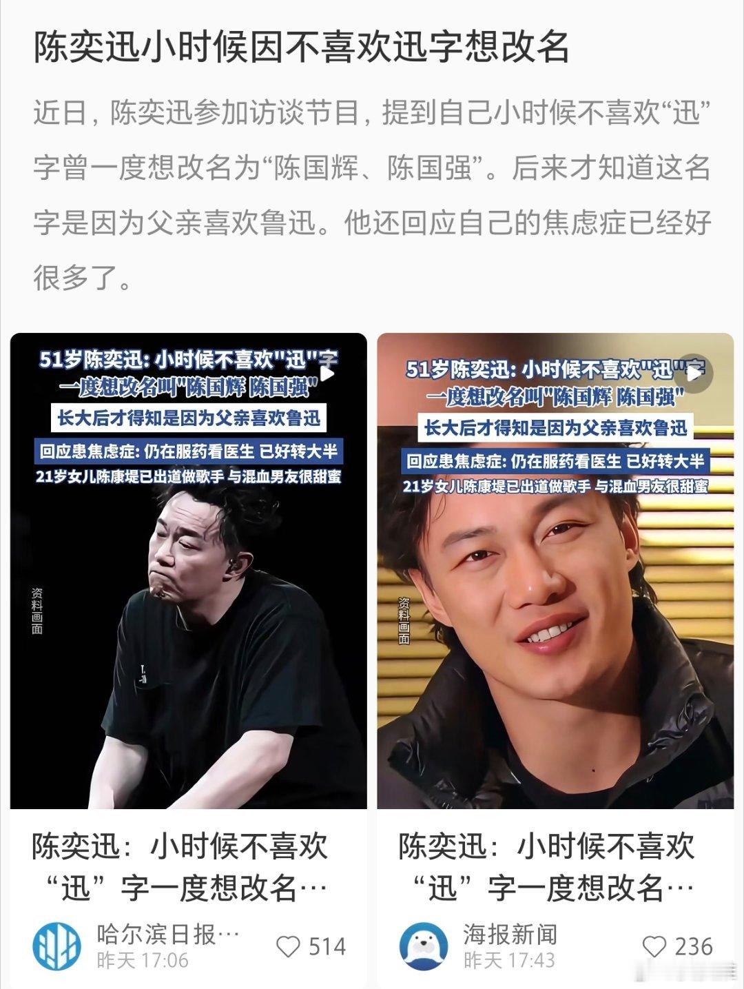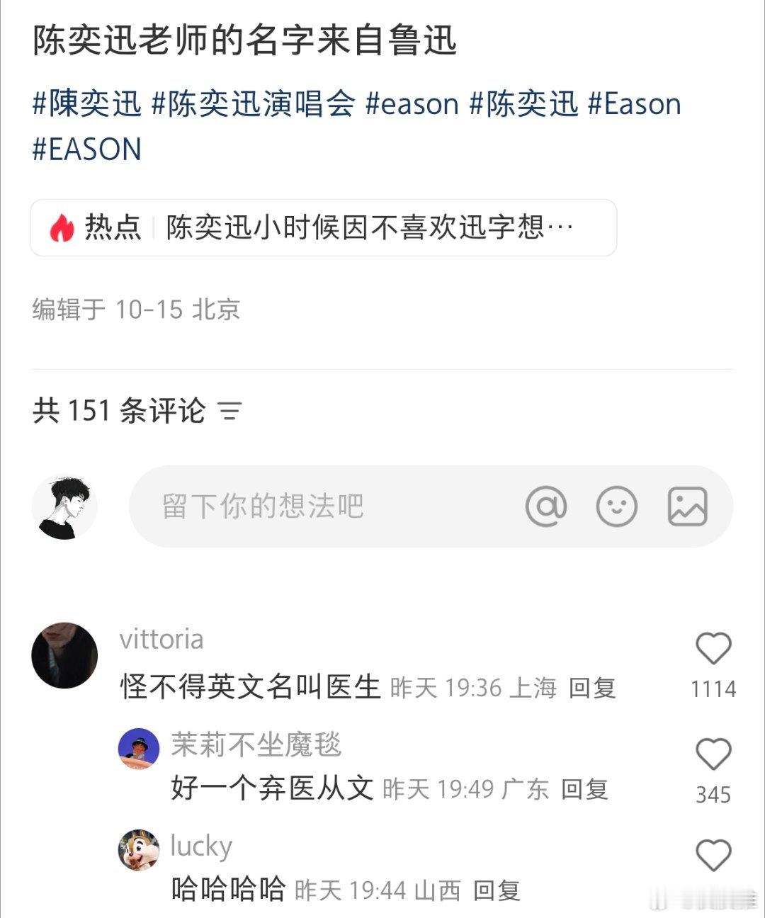 原来陈奕迅名字中的“迅”是出自鲁迅的“迅”,网友:好一个弃医从文,怪不得英文名叫医生。[哈哈][哈哈][哈哈]