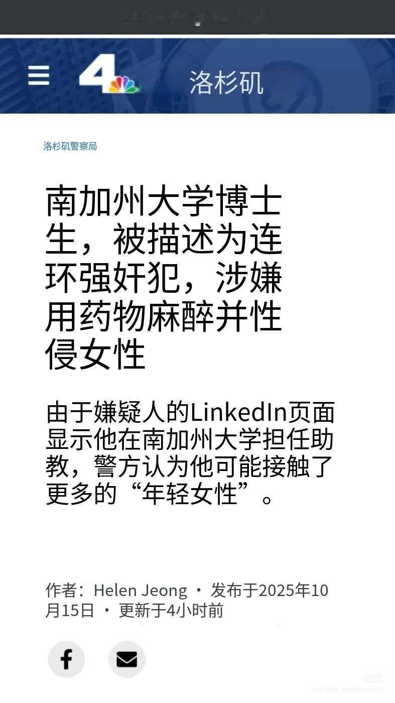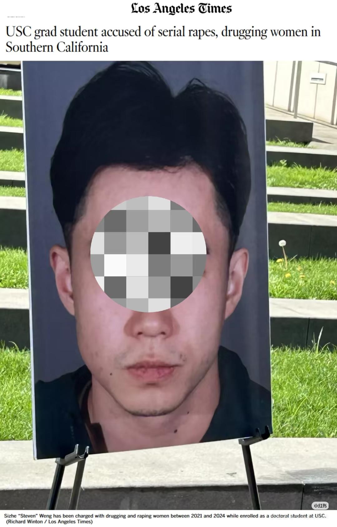 近日南加州大学博士即将毕业被指控八项重罪,翁思哲(音)在国内的家长都不知道得气成啥样了! 流程都要走完,就差交毕业论文的时候被捕,多年苦读和家庭托举面临功亏一篑。 翁同学毕业于兰州某大学,到南加州大学读电子工程博士。 据称他在2021年取得美国学生签证的同年,就开始利用药物实施x侵。 他于8月28日因涉嫌侵犯醉酒人员而被捕,随着调查深入,发现他与多起迷J案有关。 洛杉矶J方正在搜索更多的受害者,鼓励知情人勇敢出来指证嫌犯。 翁同学今年5月还发朋友圈说自己要博士生毕业了,结果还是庆祝太早了,他的8项指控里含利用药物鸡jian和强jian等行为。