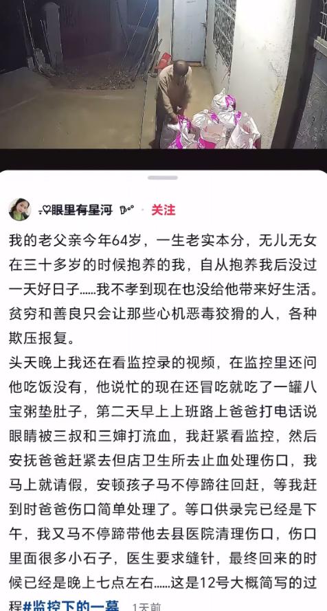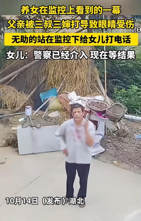 湖北一位父亲被自己的弟弟和弟媳打伤,眼角缝了九针。 这位父亲被打后,无助的站在摄像头下给养女打电话,而且白衬衫上都是血! 据金龄社会10月16日报道,湖北一位中年男子站在镜头前,白色衬衫上沾着大片刺目的血迹,眼角的伤口还在渗血,他握着手机的手微微发颤,语气里满是无助,正在给养女打电话求助。 挂了电话后,他抬手想揉眼睛,却因为疼痛猛地顿住,红肿的左眼已经几乎睁不开,身上好几处皮肤青紫,显然刚经历过一场激烈的殴打。 动手的不是别人,正是他的亲弟弟和弟媳。 这对夫妻下手毫不留情,以至于男子眼角的伤口深到嵌进了小石子,后来去医院处理时,医生足足缝了九针才把伤口合拢。 谁能想到,血脉相连的亲兄弟,会对自己的哥哥做出这样的事? 早在三十多岁时,这名男子因为没有亲生子女,便收养了现在的女儿,这些年一直把女儿当成亲生孩子对待,女儿也成了他身边唯一的亲人。 他性格老实巴交,一辈子没跟人红过几次脸,哪怕是对家里的亲戚,也总是抱着包容的心态,凡事都想着让一步。 可他怎么也没料到,这份退让,反而成了别人欺负他的理由。 弟弟和弟媳之所以敢这么肆无忌惮地动手,说到底还是打着“吃绝户”的算盘。 他们觉得哥哥没有亲生儿子,只有一个养女,在他们眼里,养女就是“外人”,说话没分量,就算哥哥受了委屈,也没人能真正站出来撑腰。 更让人气愤的是,他们不光是想欺负人,还盯着哥哥手里的那点财产,觉得“便宜了外人,不如落到自己人手里”,才会下这么狠的手。 要是当时下手再偏一点,哥哥的左眼恐怕就保不住了。 养女接到电话时,心里又气又急,挂了电话就往家里赶。 到家看到父亲满身是伤的样子,她强压着怒火,先扶着父亲去了医院。 医生处理伤口时,一边清理里面的小石子,一边叹气,说伤口太深,恢复起来要遭不少罪。 从医院出来后,养女没犹豫,直接去派出所报了警,之后又带着父亲去做了伤情鉴定,现在就等着鉴定结果出来,好追究弟弟和弟媳的责任。 让人觉得又心疼又无奈的是,就算被亲弟弟打成这样,这位养父还在替对方着想。 他拉着养女的手说,弟弟之前摔断过腰,家里为了治伤花了不少钱,日子也不好过,要是能私了,就别让弟弟赔钱了,“都是一家人,没必要闹到这份上”。 可养女这次没听父亲的,她很清楚,父亲的善良在弟弟和弟媳眼里,根本就是“好欺负”的代名词,要是这次退让了,以后这样的事还会发生。 周围知道这事的人,大多都气到发抖。 大家都说,哪有这样的亲兄弟?血脉亲情在他们眼里,好像还不如一点财产重要。 而且不管从哪说,动手打人致伤,本身就已经犯了故意伤人罪,没道理因为是亲戚就不了了之。 之前总有人说“留钱不如留手足”,可看看这对兄弟,所谓的“手足”,反而成了随时可能伤害自己的人。 现在,养女还在等着伤情鉴定结果,她已经跟父亲说好了,这次一定要讨个说法。 不是她非要揪着不放,而是她明白,善良得有底线,面对得寸进尺的人,只有强硬起来,才能护住自己和父亲。 要是一直妥协,只会让对方更加肆无忌惮,到最后受伤害的还是自己。 今天的分享到这里就结束了,大家对此事有何看法,欢迎在评论区留言和讨论,感兴趣的可以点击头像加关注,我将每日更新优质内容,我们下期见。 信源: 原文登载于金龄社会2025年10月16日关于《平时三叔三婶就一直欺负我们家,还把奶奶墓碑上我和父亲的名字给擦除了,还到我们家来抢东西,世上哪有这样的亲兄弟?》的报道