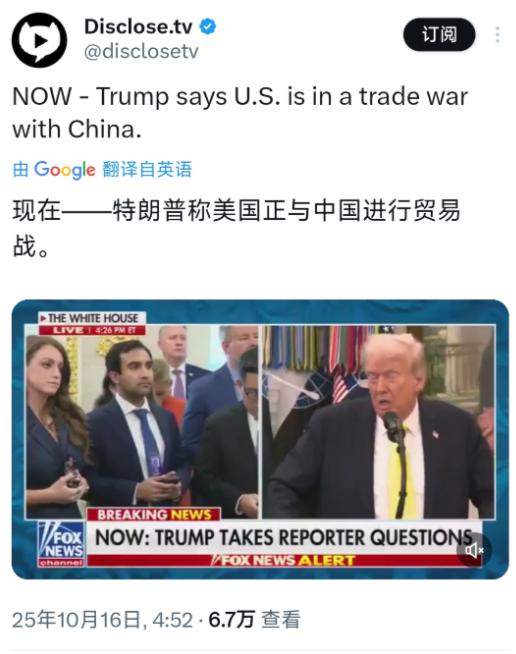 特朗普于10月16日称美国正与中国进行贸易战。 这话说得跟刚睡醒似的,合着这贸