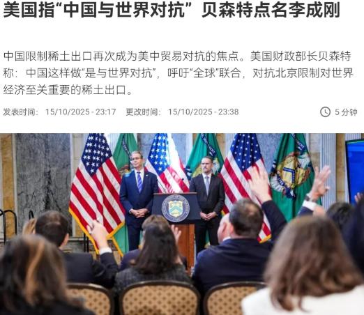 美国财长贝森特和贸易代表格里尔在华盛顿举行联合记者会,期间贝森特竟然指名道姓地威