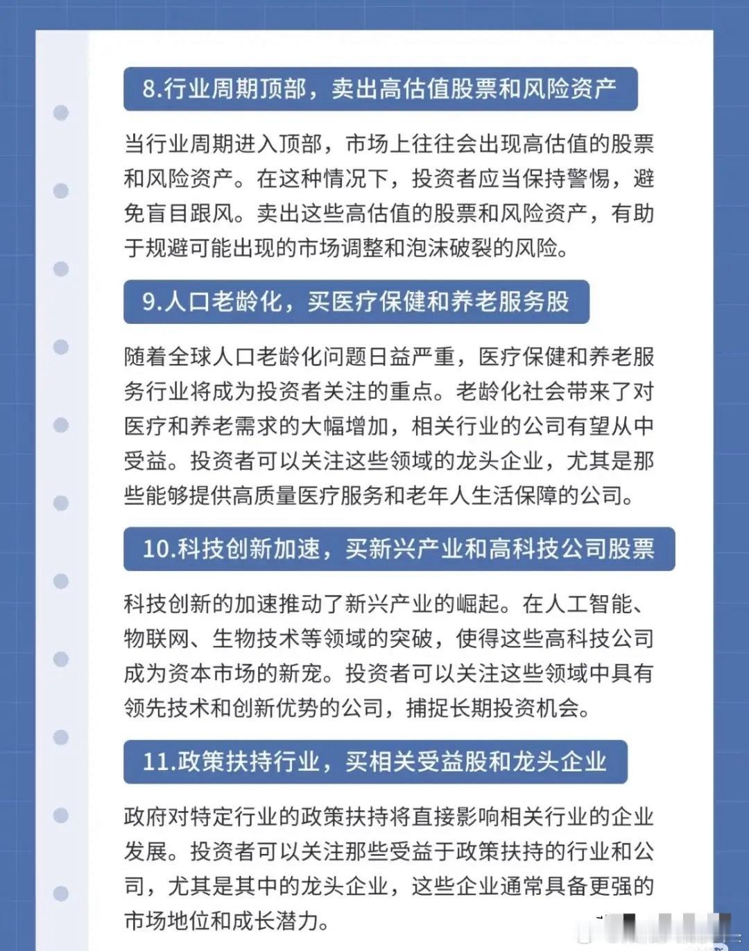 8. 行业周期顶部:应卖出高估值股票和风险资产。避免因市场过热和泡沫破裂带来损失。