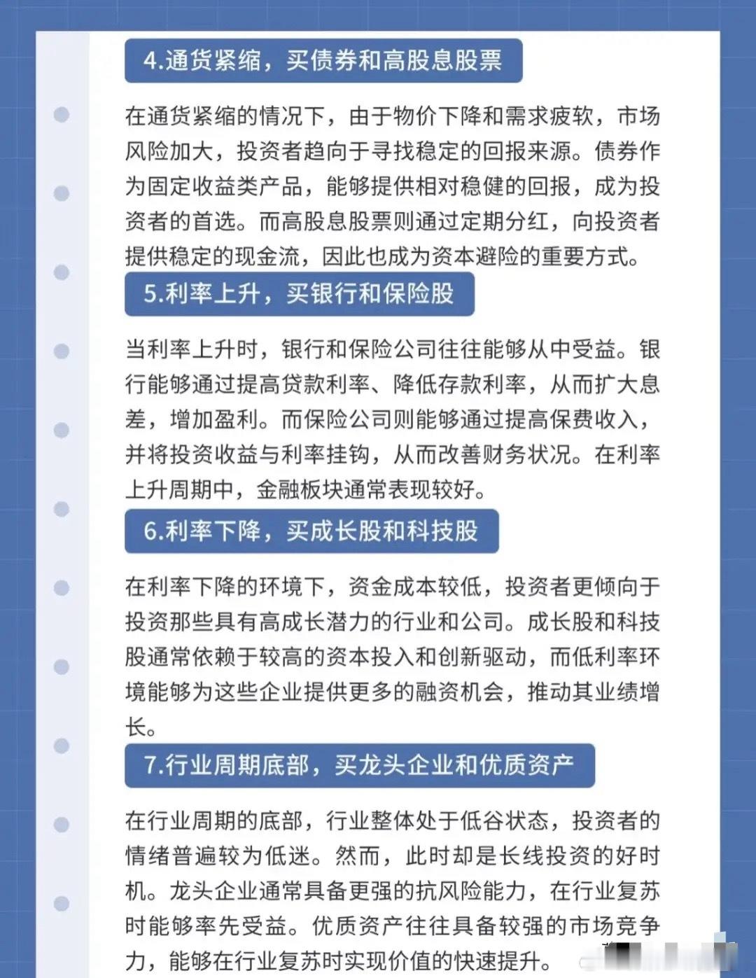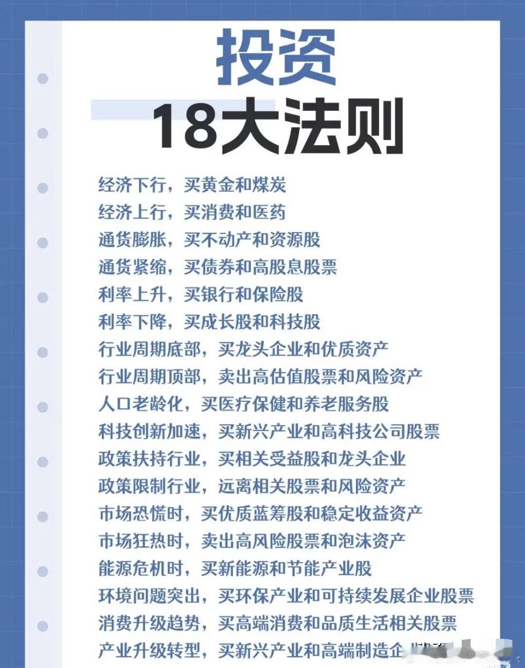 投资18大法则”,系统地总结了在不同经济、市场和政策环境下,投资者应采取的对应投资策略,旨在为投资者提供清晰、实用的决策参考。以下是各法则的核心内容总结:
