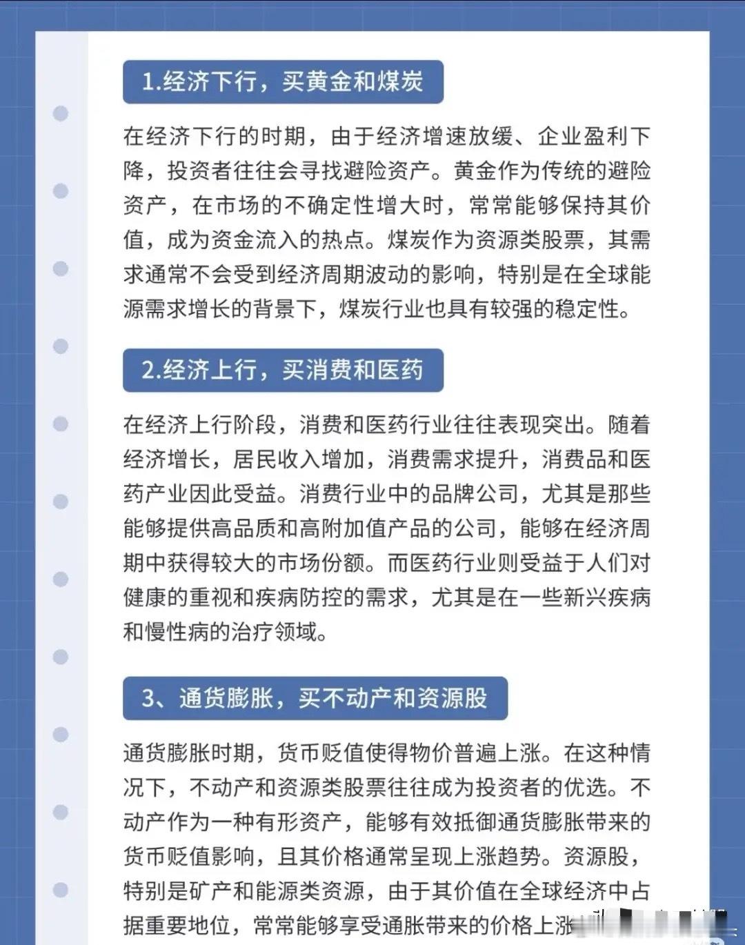 1. 经济下行:建议配置黄金和煤炭。黄金是避险资产,煤炭需求较稳定,两者均能在经济不景气时保值或提供稳定收益。