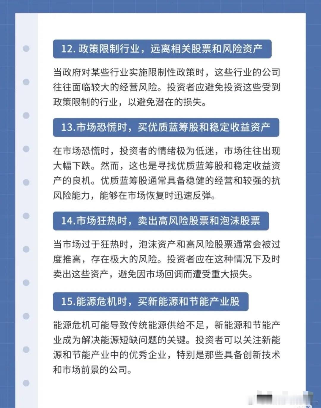 13. 市场恐慌时:是买入优质蓝筹股和稳定收益资产的好时机,这些资产抗跌性强,市场恢复时反弹空间大。