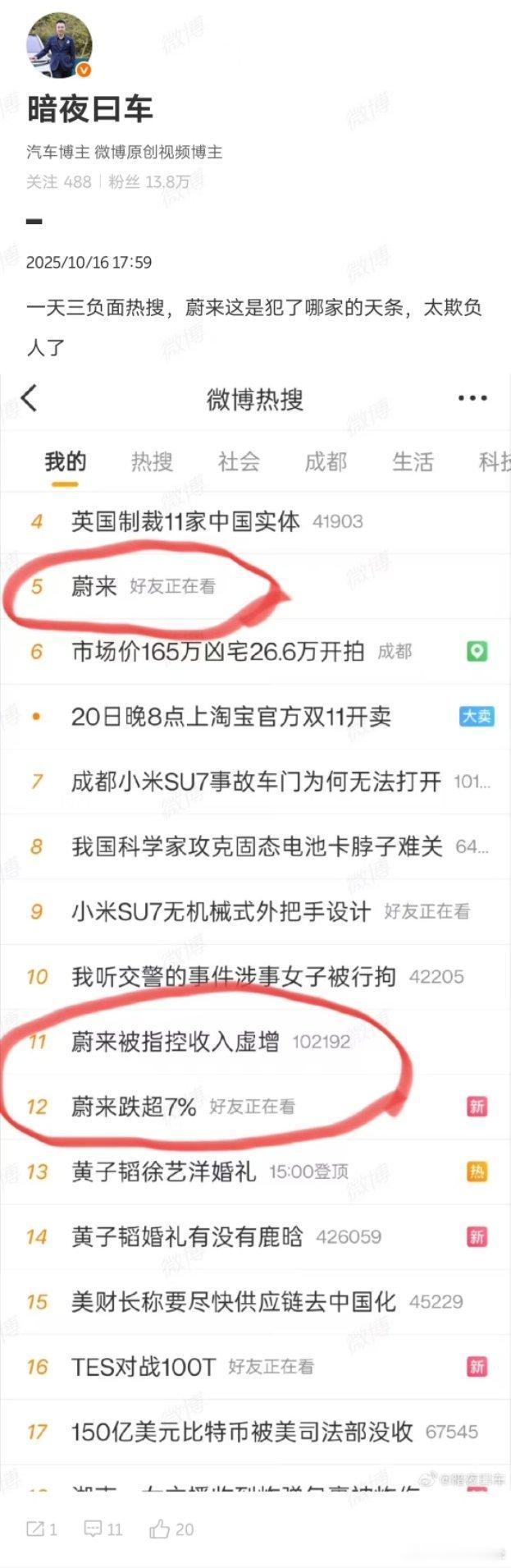 微博的【我的】,是按照博主的喜好来推荐热搜,就是你喜欢看蔚来负面,他就给你推负面,所以你看到的有三个负面也不为奇了,因为你把这个当饭吃了。
