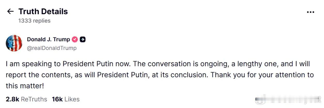 特朗普在其社交平台 Truth Social 上发文称,此次通话“良好且富有建设性”,双方已同意由两国高级顾问下周进行预备磋商。他写道:“我与普京总统随后将在布达佩斯这个双方商定的地点见面,看看我们能否让这场‘不光彩的’俄乌战争走向终结。”