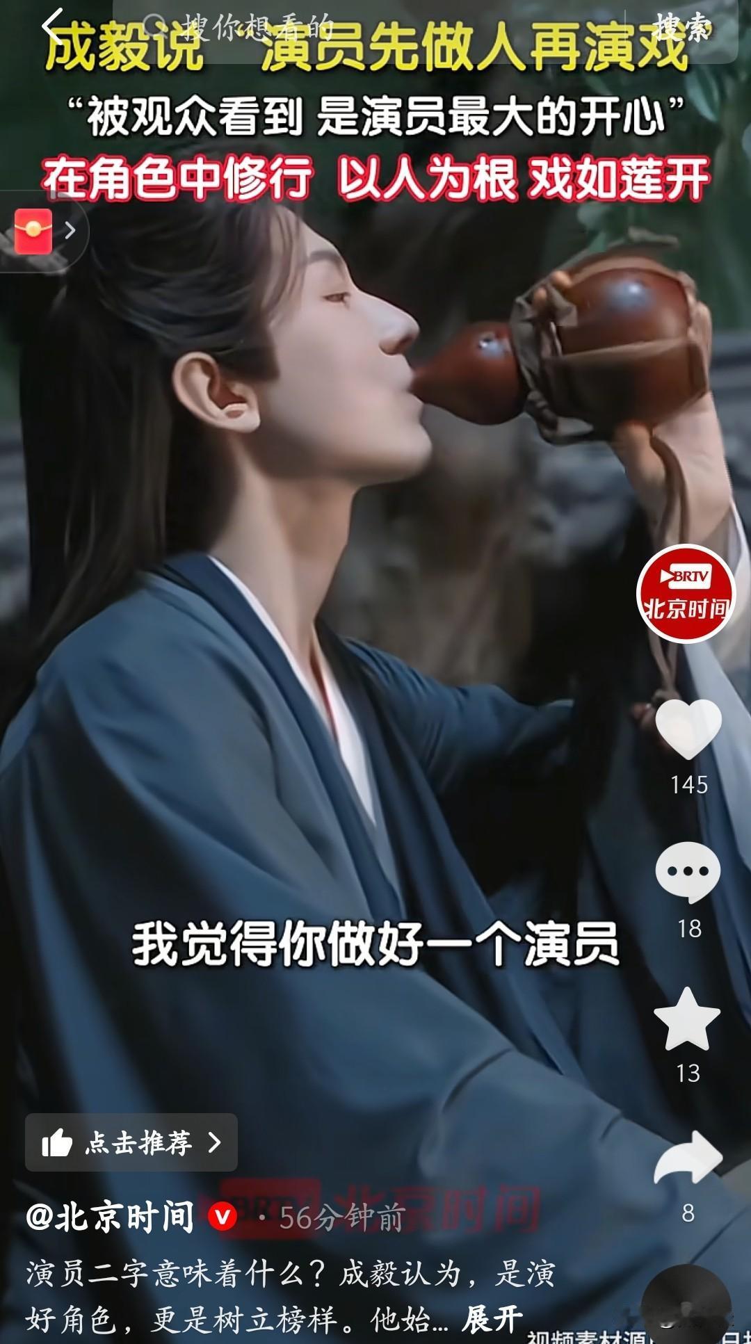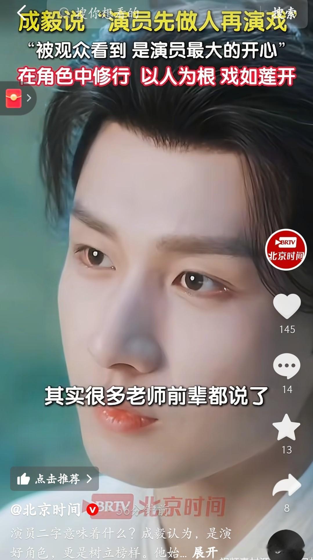 成毅这话说到演员心坎里了!“先做人再演戏”,这话听着实在。 你看他说“被观众看到是最大开心”,多实在——演员磨角色、熬日夜,不就是盼着自己的劲儿没白费? 他说“在角色里修行”,可不是空喊口号:演古装端着那股劲儿,演现代戏揣着烟火气,都是先把“人”立住了,戏才像那么回事儿。 前辈们总说“做好演员”,其实核心就俩字:真诚。你做人靠谱,演的角色才让人信;你把自己揉进角色里,观众才能接住你的情绪。 现在好多人说“流量”“快餐”,但成毅这话像杯温水——演员这行,根是“人”,戏是“果”,先把人做踏实了,戏才能开得像样。