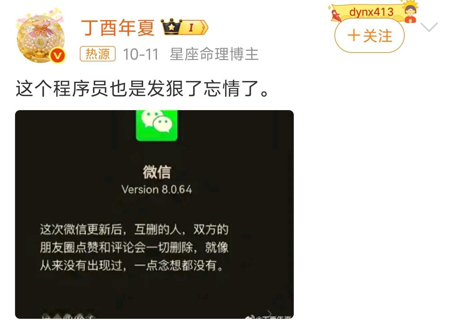 微信一删皆空这些搞迷信的博主,少造谣吧。微信正经功能都没时间更新,还有闲工夫在