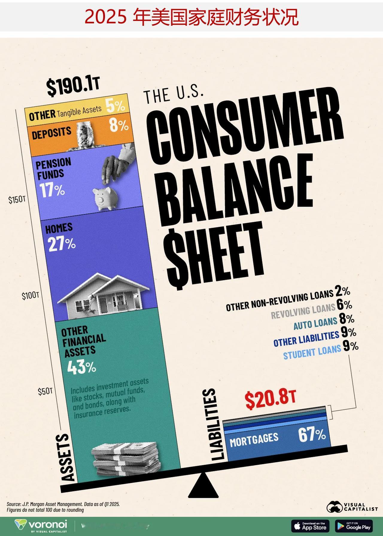 2025 年美国家庭财产与债务状况 在贸易局势充满不确定性以及整体经济前景不明朗的当下,美国消费者的韧性是经济健康发展的关键驱动力。 但消费者财富和债务的不同组成部分总体上又是如何划分的呢?这些数据又能为我们揭示美国家庭的财务状况如何呢? 这张图表展示了 2025 年第一季度美国家庭的财务状况,数据来源于摩根大通资产管理公司。 ——美国家庭财务状况:2025年第一季度资产情况 下面图表展示了美国消费者资产总额达 190.1 万亿美元。 其他金融资产(如股票)占全部财富的近一半——其规模大致相当于住宅资产和养老金基金的总和。 值得注意的是,家庭金融资产中直接和间接持有的股票所占比例达到了历史最高水平,这得益于强劲的股市。同时,房产资产占消费者财富的 27%,这一比例也是总体排名第二高的。 存款总额占 8%,而银行存款余额却低于以往的正常水平,这或许表明消费者正将现金储备投入到其他类型的资产中,比如股票。 ——美国家庭财务状况:2025年第一季度负债情况 以下图表也展示了美国家庭的负债总额为 20.8 万亿美元,其中住房贷款占了总额的约三分之二。 紧随其后的是学生债务问题,到 2025 年第二季度时,其总额已达到 1.6 万亿美元。 如我们所见,汽车贷款占总贷款额的 8%。近几个月来,由于生活成本上升和通货膨胀对消费者财务状况造成影响,拖欠贷款的情况有所增加。目前,拖欠率已达 5%,这是至少五年来最高的水平。为了