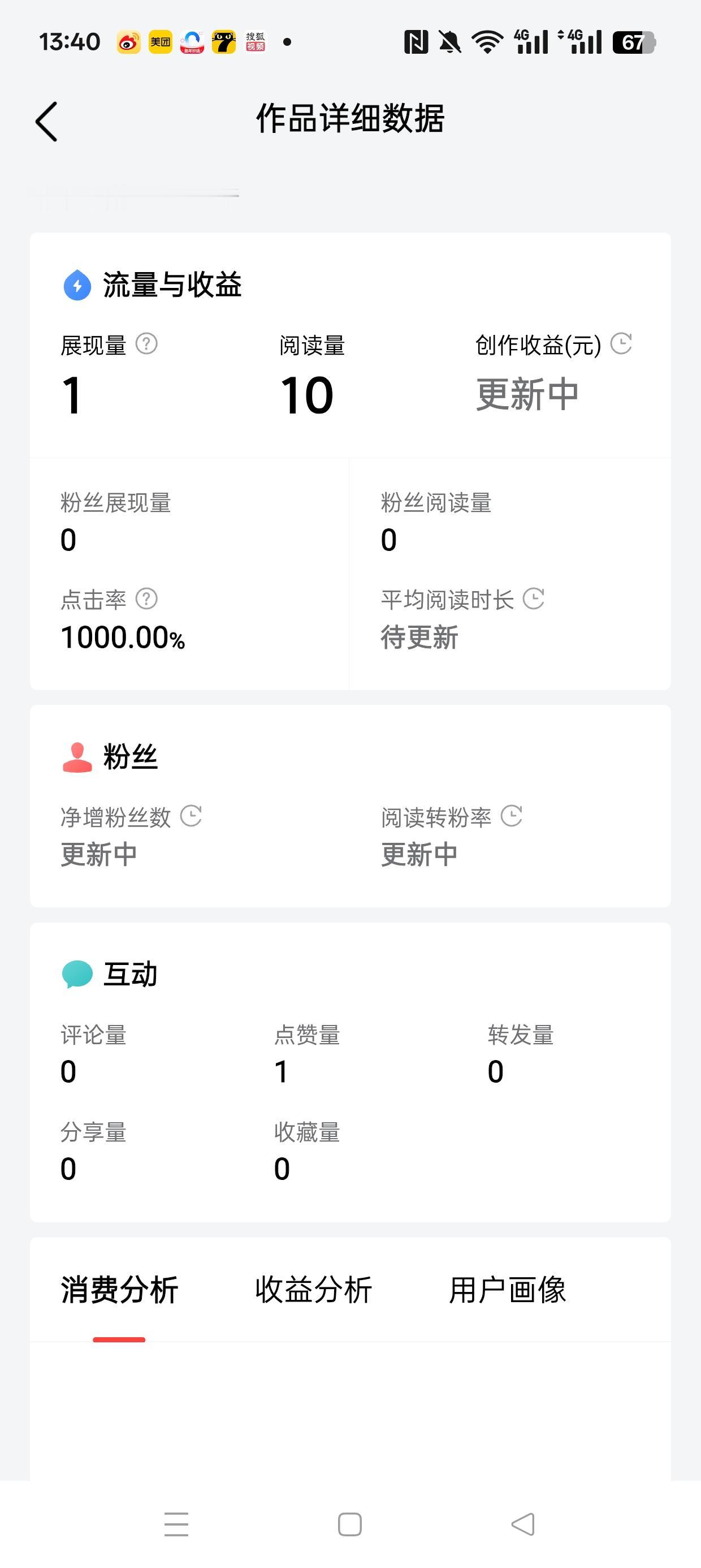 真搞不懂,发布一个小时,只有一个展现量,却有10个阅读量!这张后台截图显示,作品