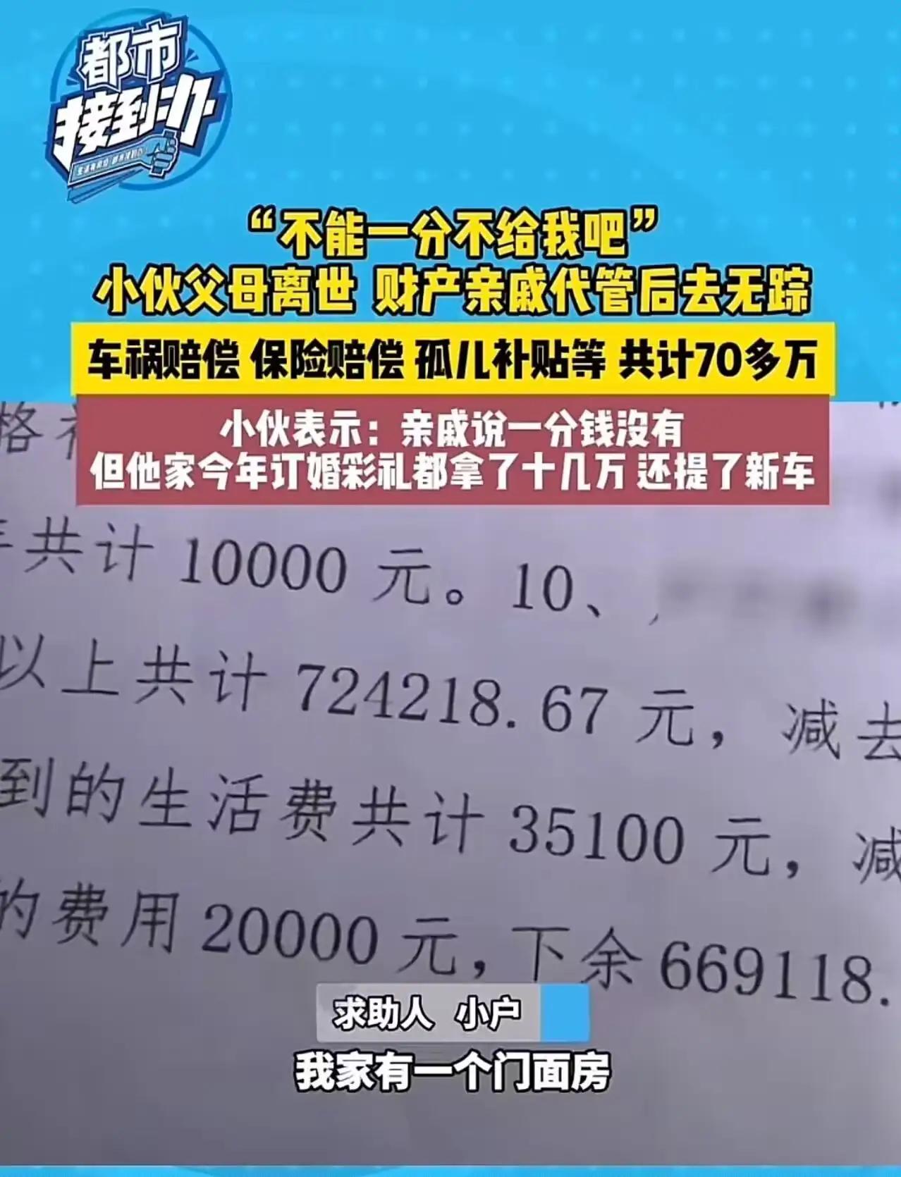 小伙六年级父母离世,70万财产由亲戚代管。现在他长大了向亲戚要钱,亲戚却说一分钱