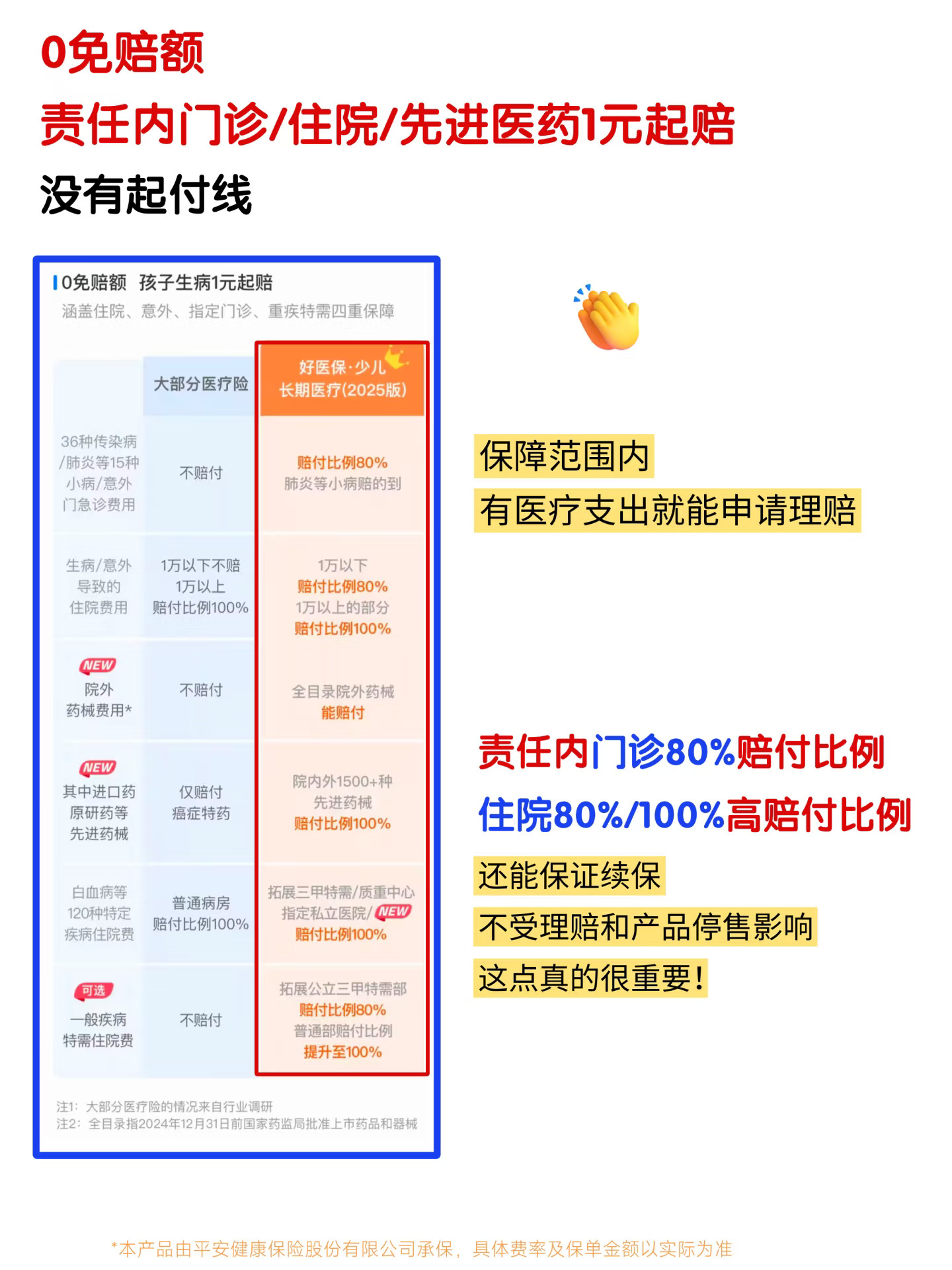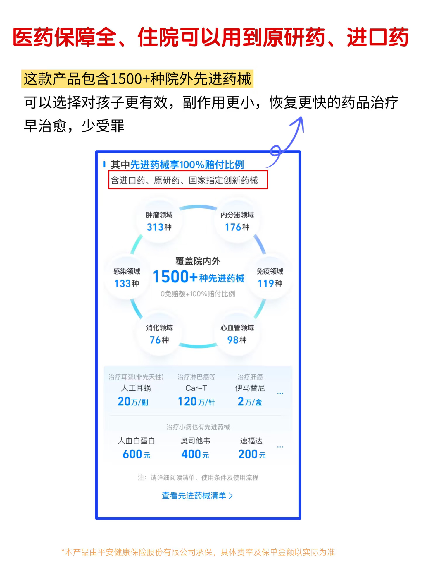 4️⃣好药不将就,治病更安心:住院后用到的原研药、进口药、创新药也都能报销,除此之外还囊括了1500种先进药械,清单内100%比例报销,经处方审核后院外药也能赔,不怕“好药用不起”、“院内缺药”耽误娃恢复。