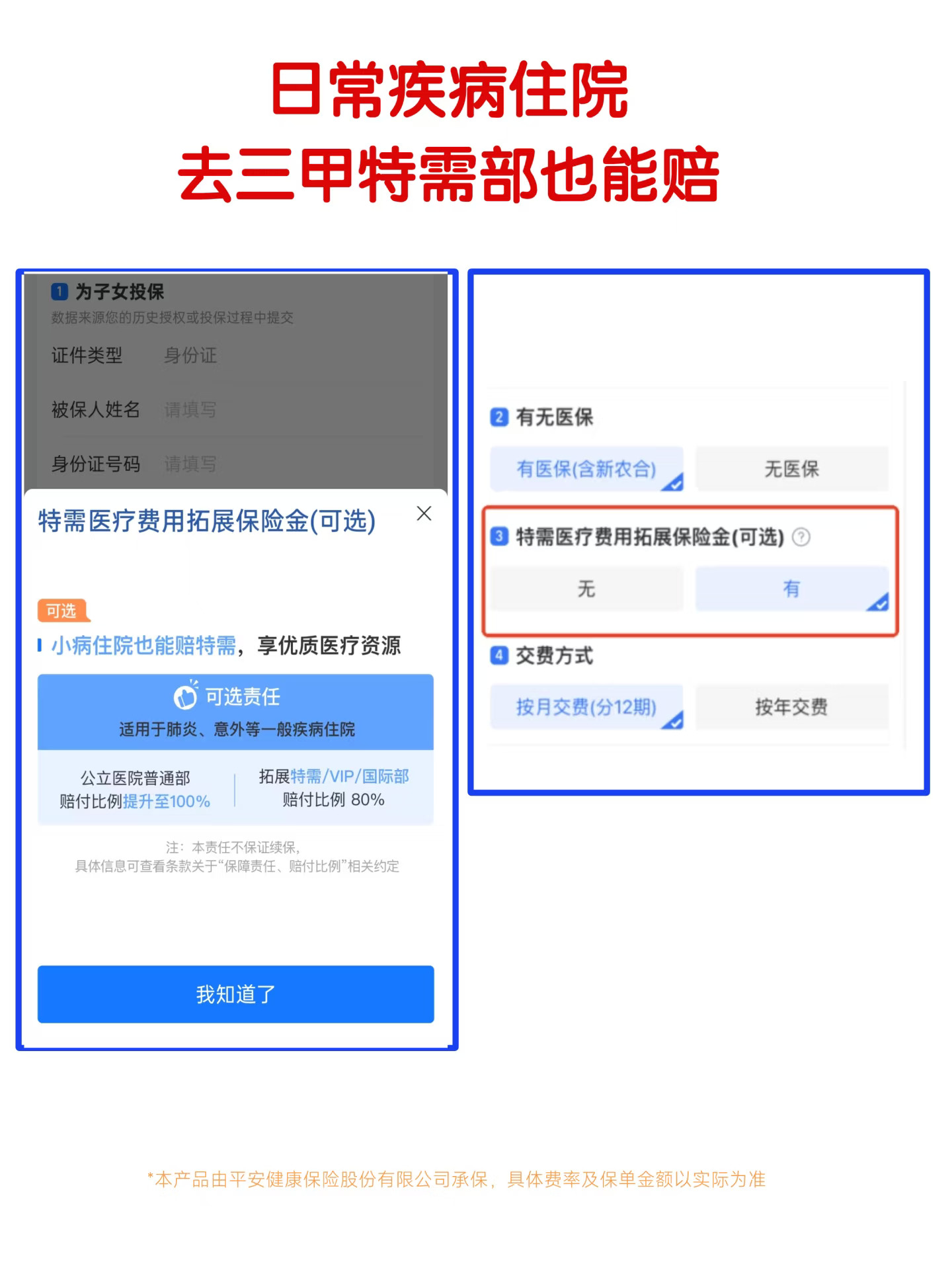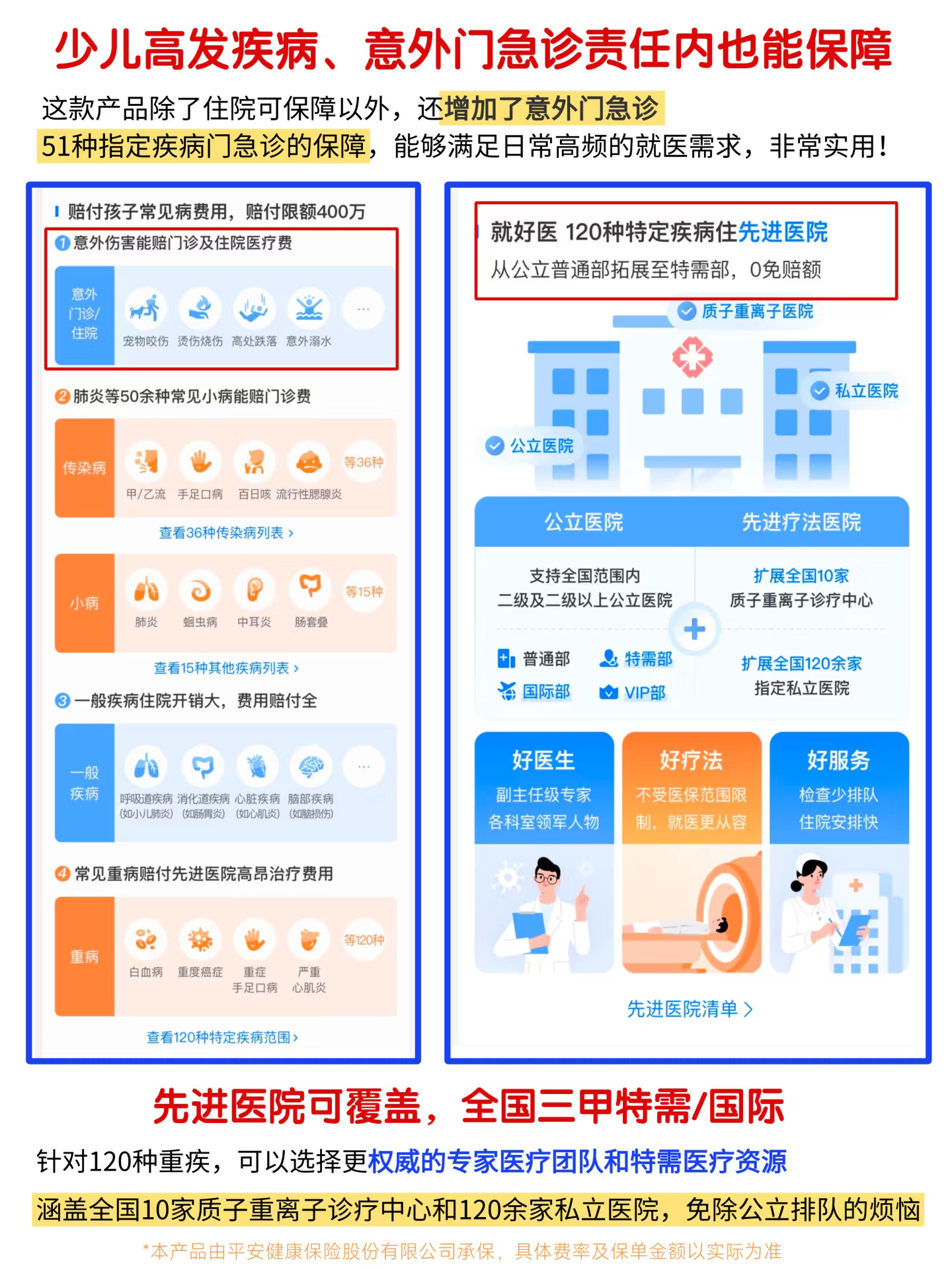 3️⃣大病有好选择,治疗不心慌:120种少儿重疾住院去三甲特需部、质子重离子医院和私立医院,能100%比例赔付。不用为了省钱妥协治疗环境,关键时刻有好的选择;现在还可以拓展保障范围,勾选附加包后,不仅普通部住院的报销比例提升到100%,肺炎这类常见病也可以去特需部报销80%比例,日常来说更实用。
