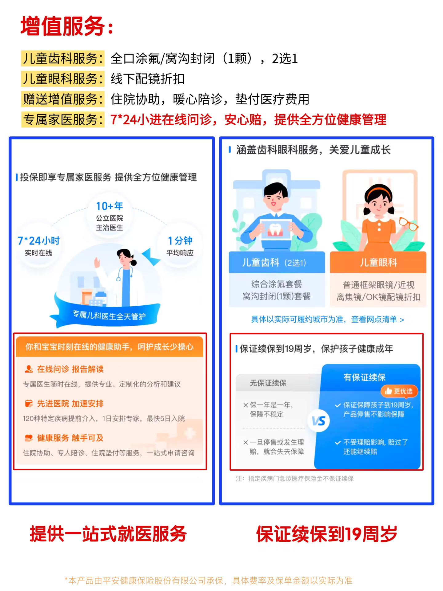 6️⃣还有丰富实用的增值服务:儿童齿科能涂氟或者做窝沟封闭,眼科有配镜折扣,而且更重要的是还有7×24小时专属家医在线问诊,娃半夜不舒服随时能问,不用瞎折腾。