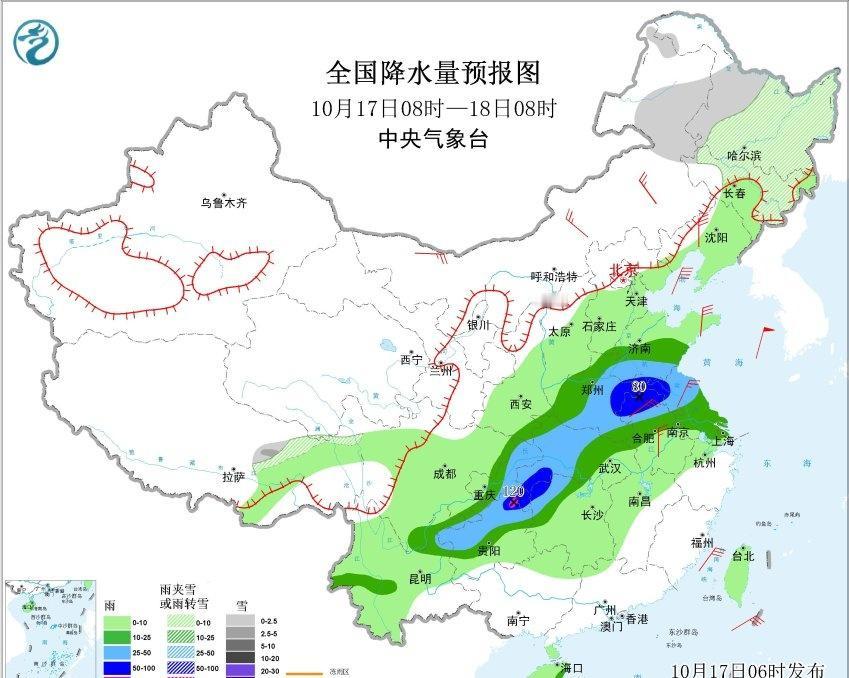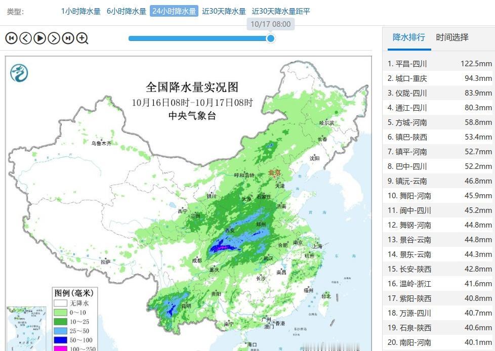 昨夜今晨秋雨带进入“最后疯狂”,雨带大范围笼罩西北华北西南华中多地,尤其是四川河南陕西重庆三省一市雨势最为猛烈,四川平昌国家站降雨122.5毫米打破单日降雨纪录(08-08)、局部降雨逼近200毫米;此外石家庄和西安泾河国家站在雨中打破10月降水量纪录。 今天白天暴雨带依然维持在川东重庆陕南鄂西到河南山东皖北一带,汉江上游、渠江流域将出现明显涨水甚至编号洪水过程;预计今天下午秋雨带开始南下,云南贵州湖北安徽将成为明天强降雨的重点。