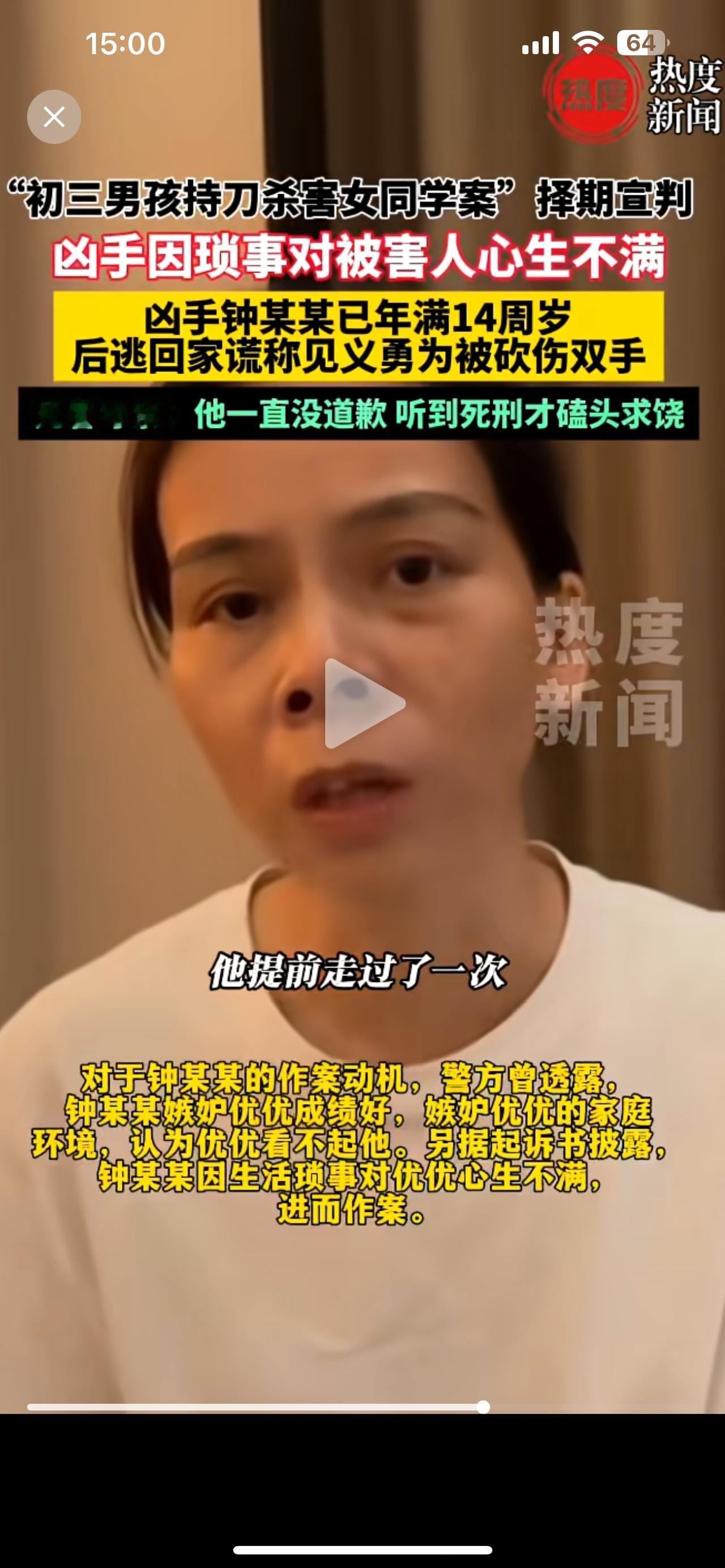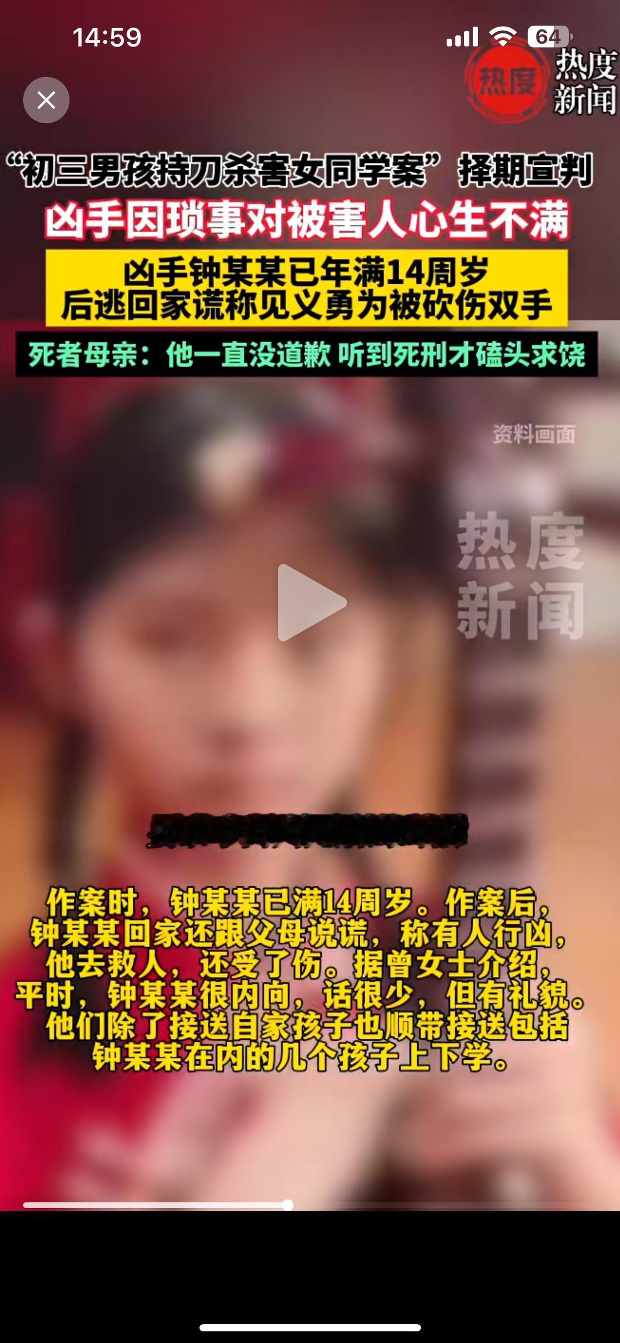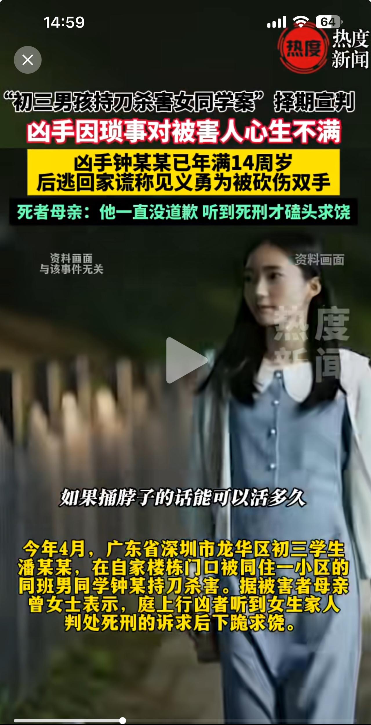这起悲剧事发广东深圳市龙华区。 这位初中小潘女生品学兼优,奈何天妒英才,被这个14岁的邻居男生无缘无故捅死。 被害女生的家长经常顺带接送他,没想到这个怪胎不但不记情,反而莫名其妙行凶。 小小年纪就如此歹毒,很显然和他的日常家庭教育分不开,有怪物孩子必有怪物家长。案发后,这怪物都没有道过歉意,没有悔改。 在法庭上,听到被害人家长要求判其死刑,这怪物立马怂了下跪求饶。他还知道偷生!还想活命!当初为什么要剥夺别人的生命? 现在的孩子身高体重心智都比以前的孩子成熟,应该修改死刑年龄,改到14岁,不放过一个坏人,不能让被害人冤死。