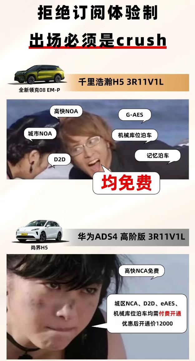 这俩车的智驾政策,各有各的“香法” 领克08 EM-P的智驾是真敞亮,不管高快NOA还是机械库泊车,全给配满还免费。尚界H5的华为ADS4高阶版得花12000开,但听说功能细节更细腻。但谁不想要免费的呢,有没有车主说下,领克这免费智驾的实际可靠性咋样?跑复杂路况稳不稳? 领克08 EM-P 尚界H5