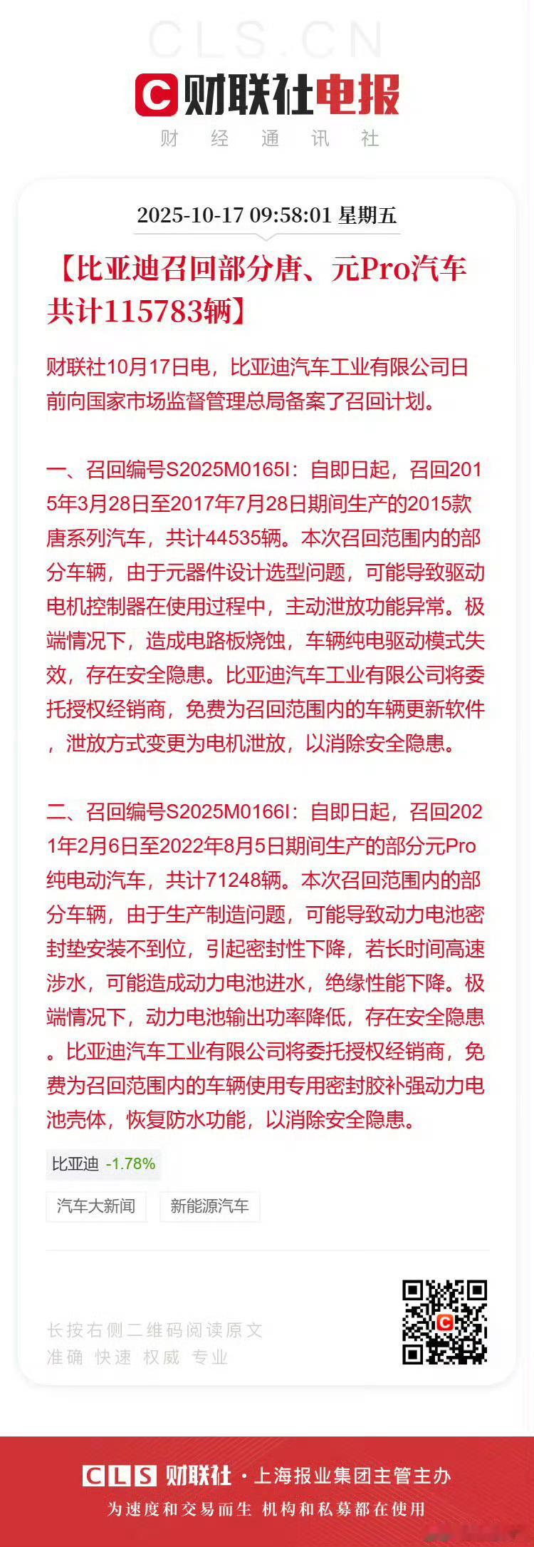 比亚迪召回115783辆汽车 10 年前生产的车现在还能在召回之列,迪子可以的