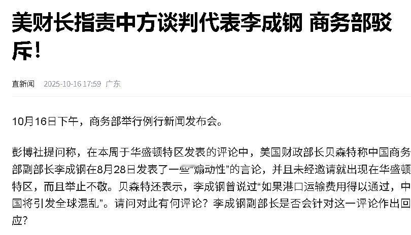 [下雨]美国想要让中国更换国际贸易谈判代表,目的何在?10月15日,美国财长贝森特在发布会上,点名指责中国国际贸易谈判代表,商务部副部长李成钢是一个无理和难缠的角色。 其实李成钢在中美贸易谈判中一直以务实、强硬著称,条理清楚,底气十足,立场分明,他常常用数据和事实应对美方的各种难题,这让美国代表团感到头疼。 美方这次点名批评,很明显是想让中国换个人出面,换成一个他们认为更容易将谈判推进下去的人,用公开场合来制造舆论压力,还带着几分赌气的意味。 发布会还有一个耐人寻味的细节。美国商务部部长卢特尼克本应出席却意外缺席。这背后据说是因为在扩大出口管制清单这件事上做得不尽如人意,惹得特朗普不高兴,内部气氛已经不是那么和谐。 内部有了杂音,外部又急着甩锅,这场闹剧把美方真正的问题暴露得很彻底。 如果从头看过去,中美贸易谈判已经拉扯了好几年。每一轮谈判,彼此角力不断加码。 中国代表越来越注重实际利益,风格也更沉稳,李成钢的表现几乎成了中方强有力姿态的标签,在关键议题上寸步不让。美方习惯了主动,如今吃了瘪,于是打起了这种小动作。 美国在镜头前要求中国换代表,表面是对李成钢的不满,实际上是对结果的不甘。他们或许希望通过压力和羞辱让中方让步,但实际情况却恰恰相反。 中国团队不仅没有自乱阵脚,反而更公开地表达了坚定的立场,李成钢没有退场,反倒成了关注焦点,这让美方的算计似乎落了空,招式用尽反倒补刀了自己。 反观美方内部,卢特尼克的突然消失、传闻中的批评与不和,说明他们在把控大局上出现了一些失误。 团队的不团结只会让外界看到他们的不稳定,这直接影响了谈判桌上的筹码。当外部说辞和内部管理都出现问题,真正想推进谈判反而变得更难。 接连的指责和动作说明美国的策略有了变化,但在这种高压下,中国代表并没有像预期那样妥协,更没有被情绪带着跑。 李成钢顶住了压力,这不仅维系了谈判的主动权,也为中国争取到了更多尊重。 整个事件最有意思的地方,是美方强压之下反暴露出自己的软肋,而中方的反应更显从容。贸易谈判中谁都不会轻易松口,谁能撑到最后,谁就可能笑到最后。 在这个过程中,专业素养、团队合作和心理素质都很关键,美方拍桌子固然能吸引眼球,但想靠这个改变谈判结果,恐怕有些想多了。 真正能左右谈判进程的,始终是实力和底气,而不是靠喊话、甩锅或者舆论施压。中美这场较量还远没到定局的时候。