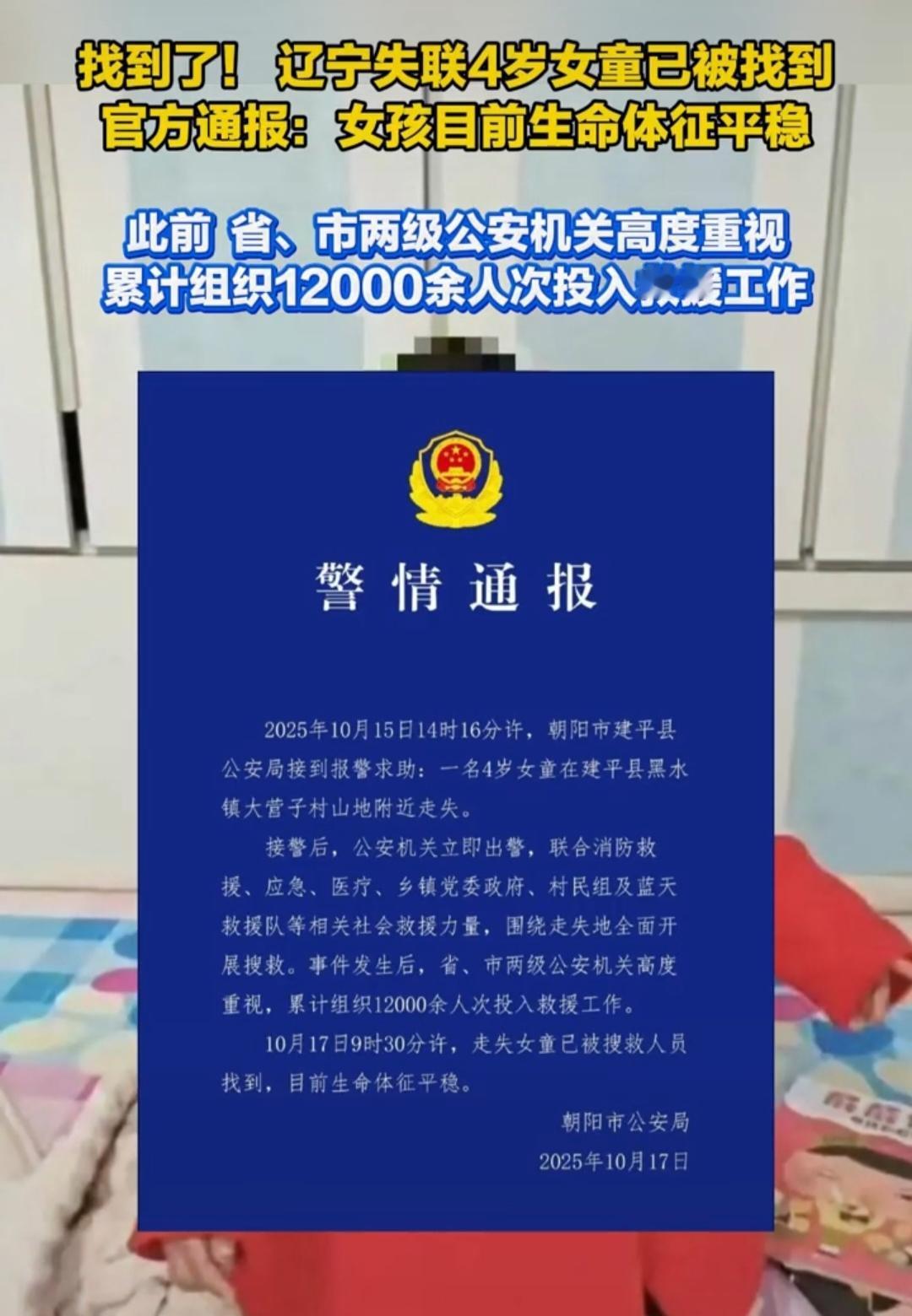 辽宁4岁失联女童找到了!最感动的一幕也出现了! 从10月25日下午2点多警方接