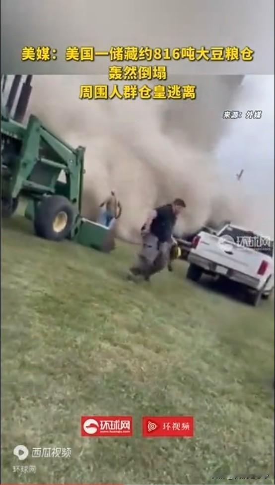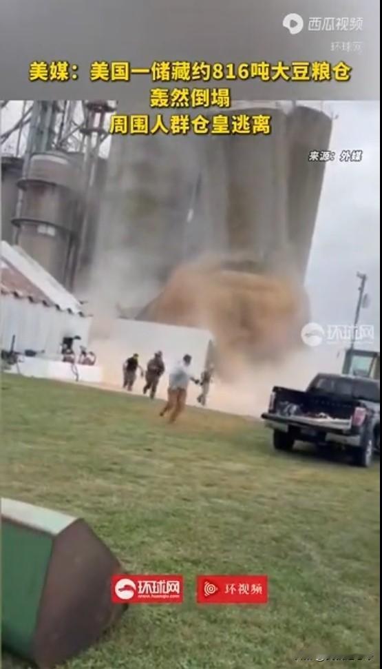 美国一处储藏了816吨大豆的粮仓,突然崩塌了!没有任何的意外,就是活生生的被压塌了! 这下您知道美国的大豆到底积压有多严重了吧? 据今日美国报等媒体报道称,美当地时间15号。 美国伊利诺伊州的一座谷仓突然发生了崩塌事故! 这座谷仓当时储存了816吨大豆,也没有什么预兆,突然就塌了! 大豆如同瀑布一样倾斜而出,黄豆粒崩的到处都是! 大家看现场的照片,里面还有火光出现,那个不是什么爆炸,也不是什么人为纵火! 而是倒塌的谷仓压倒了旁边的供电线路,引发的电火花。 电火花夹着大豆卷起的漫天尘埃,向现场的民众扑去! 吓得人们四散奔逃! 目前事故依然在调查之中! 好了,这件事儿不管是人为破坏还是谷仓年久失修。 反正他就是发生了,这一下您知道美国大豆积压的有多严重了吧? 美国大豆这件事还真的不好办了! 中国死活不买,其他国家根本就吃不下这么大的量! 那么唯一的办法就只能让美国人民磨豆腐了。 豆浆,豆腐脑,老豆腐,豆腐干,豆腐皮,就让美国老百姓换着样的来吧! 欧美不是流行素食主义吗? 那些推崇素食主义的人们应该率先做一个表率? 一个人买个百八十吨,慢慢吃吧!