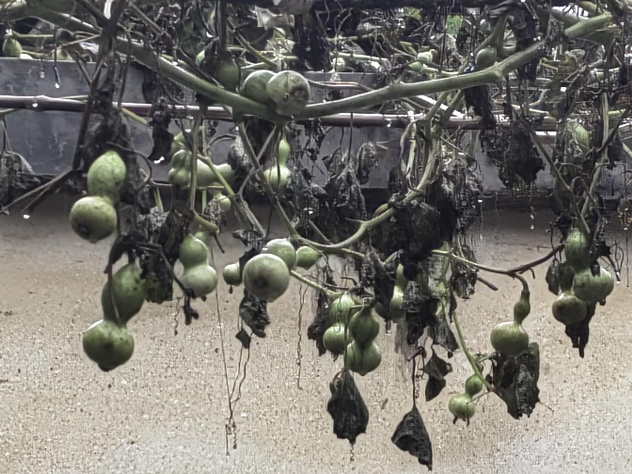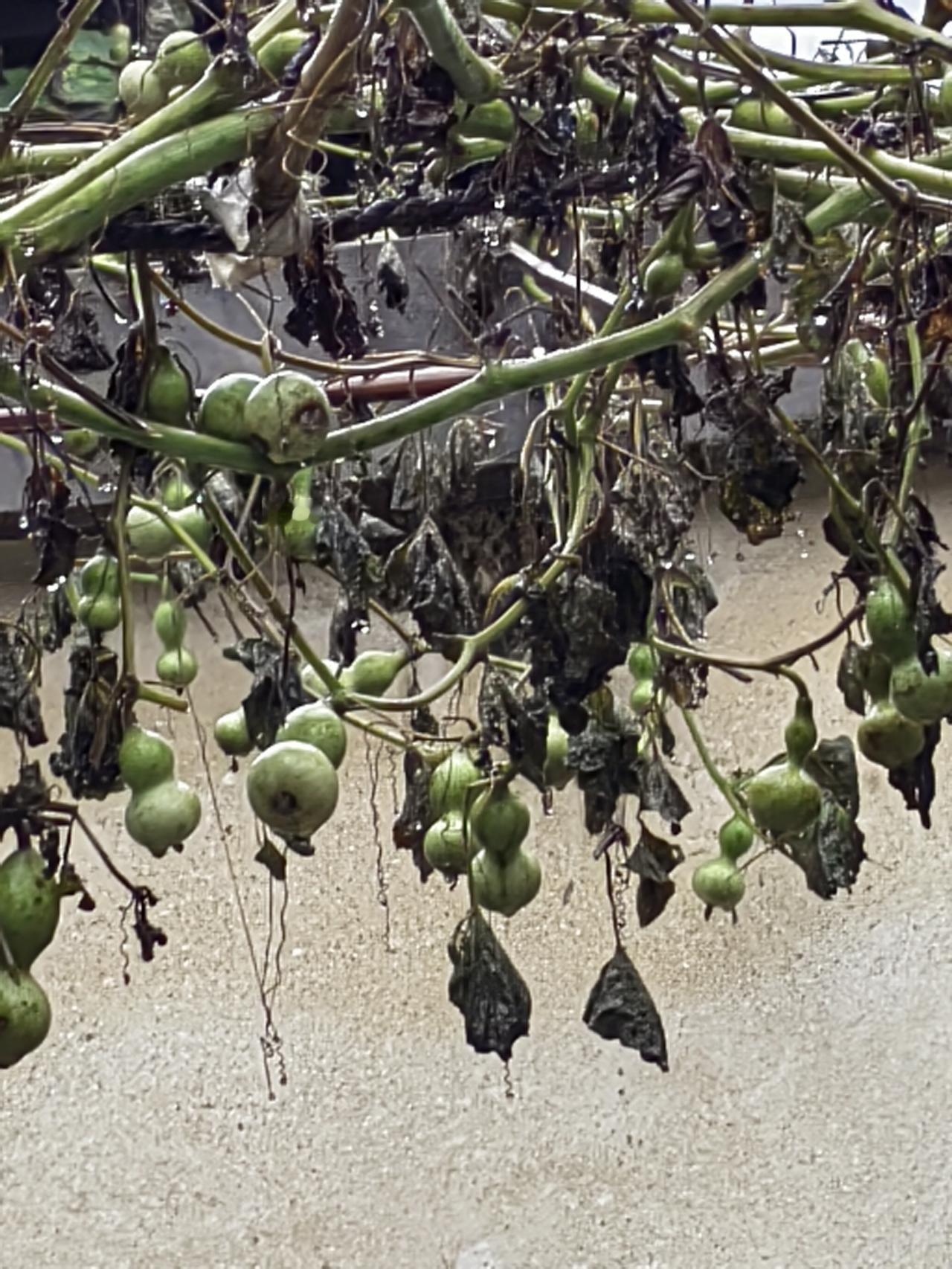 太窝火了! 种了一颗迷你小葫芦,辛勤管理,期盼着看到藤蔓上挂满葫芦,随风摇曳的美好场景,想想都美! 谁想到,被这罕见的、连绵不断的秋雨给糟蹋了! 墨绿的叶子因长期雨淋,腐烂变黑,没有成熟的小葫芦也生了霉斑,失去了可爱的样子。制作葫芦挂件的愿望,也成了泡影! 真可惜啊!