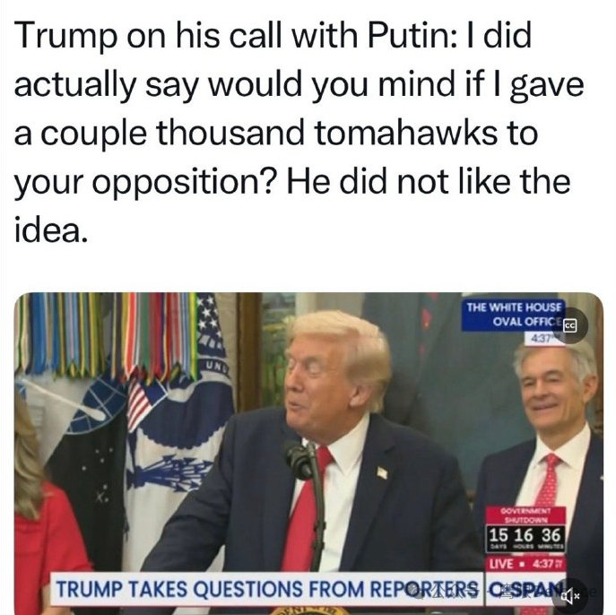不确定特朗普是真打算向乌克兰提供两千枚“战斧”,还是一贯的大嘴巴或者威胁普京,但可以确定的是,这些“战斧”导弹都会由除美国之外的乌克兰支持者们买单。