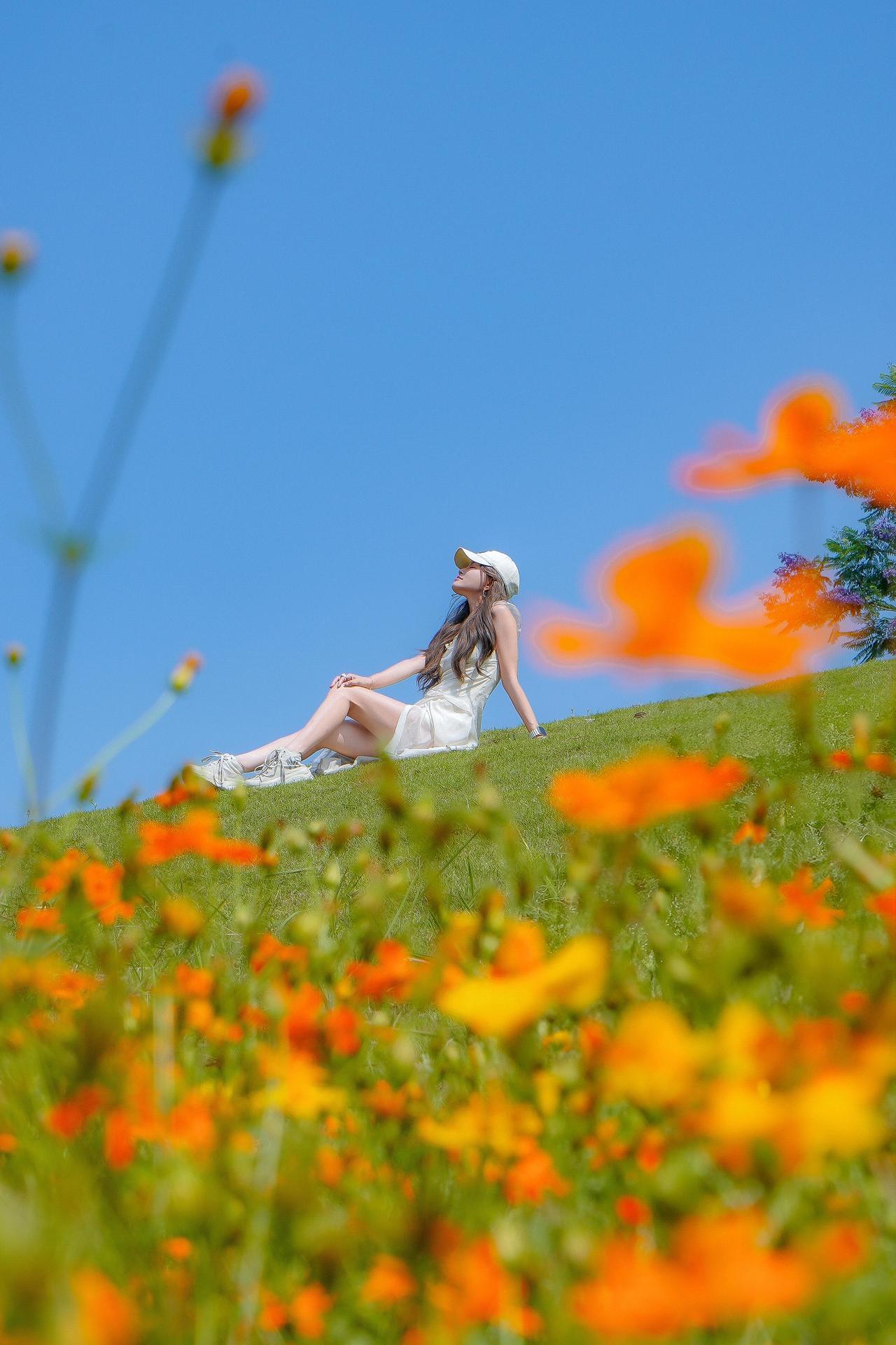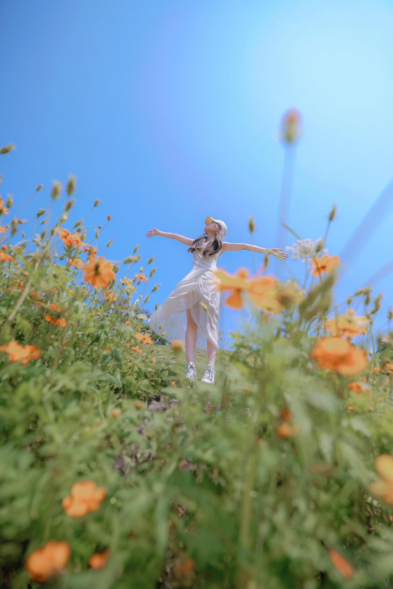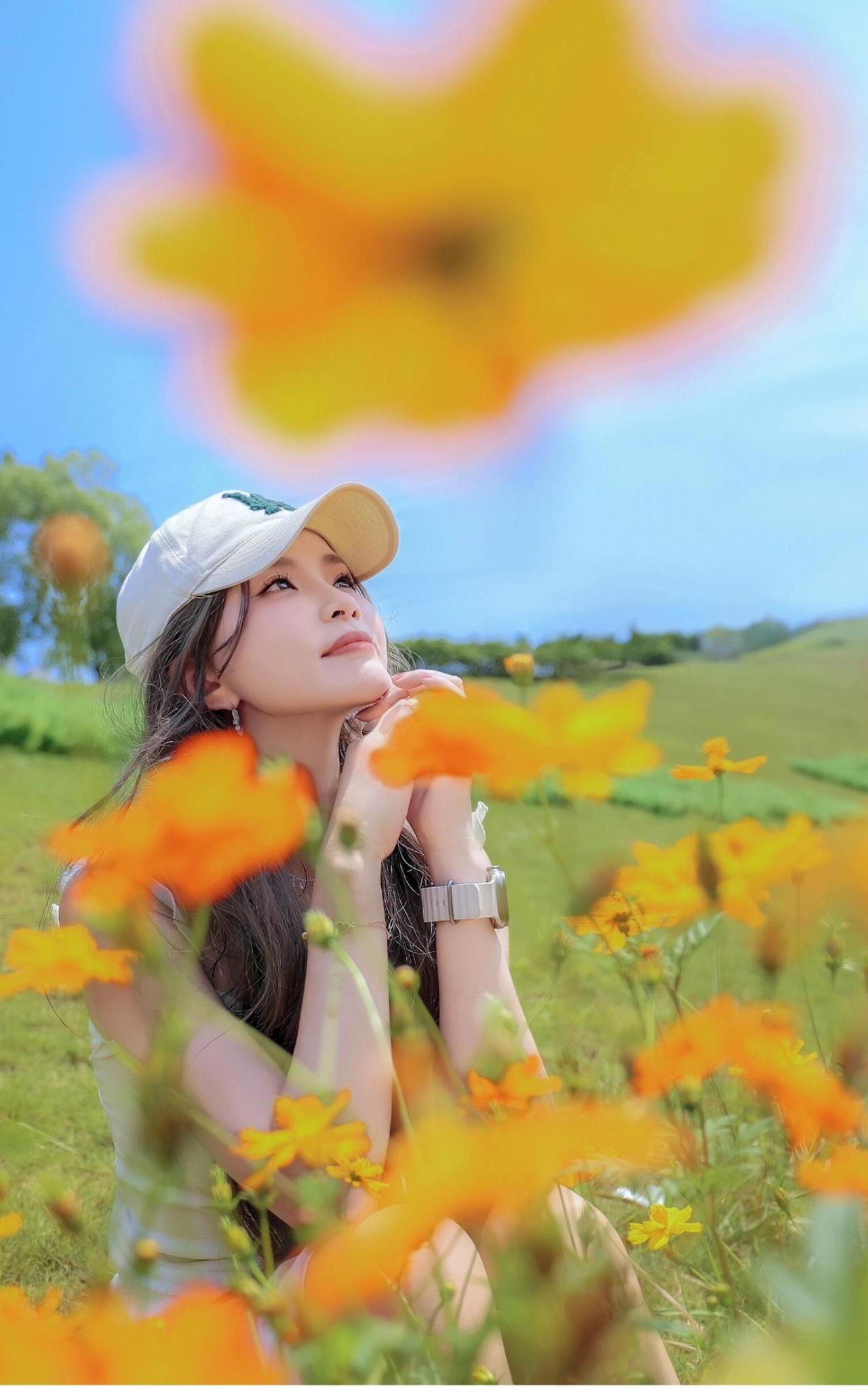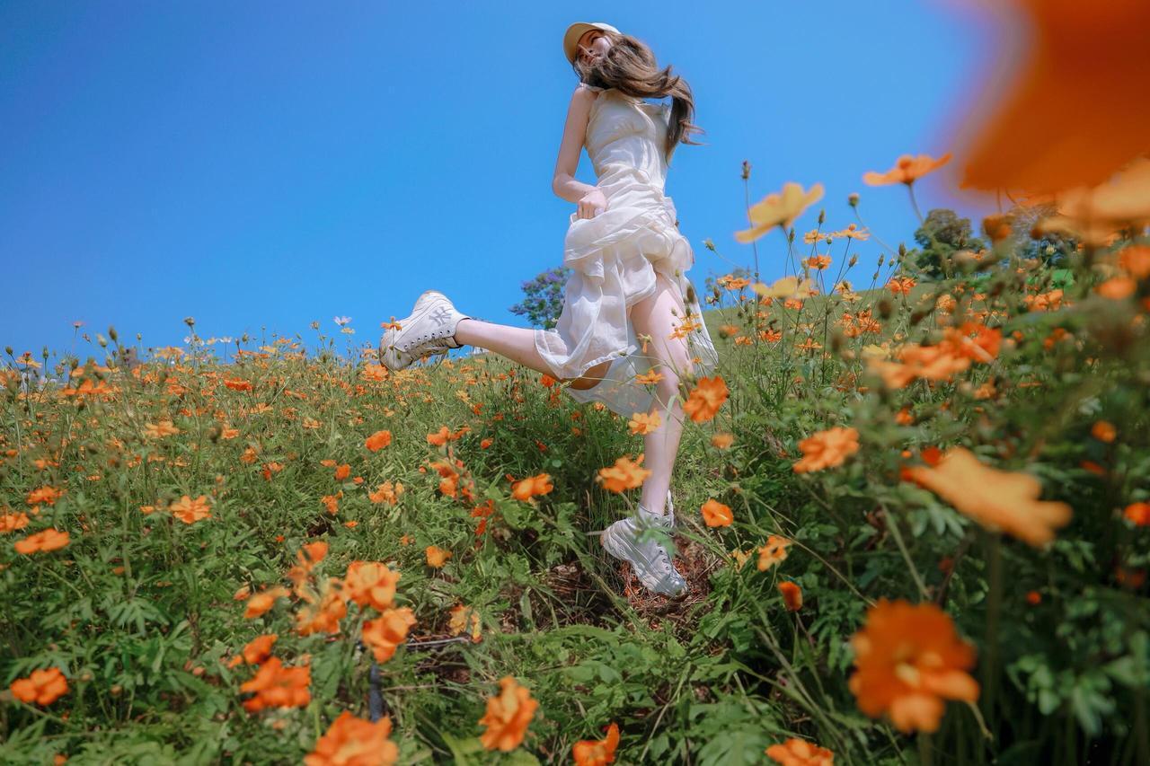 当明艳的山花遇上灵动的人像,关于色彩与层次,摄影者以山花为天然幕布,将人物巧妙嵌入其中,构建出充满活力与浪漫感的画面。 在色彩运用上,大片橙黄色的山花与澄澈的蓝天形成强烈的冷暖对比,既突出了山花的明艳热烈,又让天空的纯净感成为画面的“呼吸区”。人物的白色服饰在这片色彩海洋中如点睛之笔,既不抢夺山花的视觉焦点,又能清晰地勾勒出人物轮廓,这种色彩的搭配既和谐又富有冲击力,让画面的活力值拉满。 构图的层次营造是另一大亮点。第一张图采用低角度仰拍,让山花从画面下方铺陈开来,人物立于花海之上,形成“花潮人海”的纵深感,前景的虚化山花更是增强了这种层次,让画面富有立体感。第二张图的大场景构图则展现了山花的繁茂与辽阔,人物在花径中行走,成为连接画面左右的视觉线索,让观者感受到山花海洋的浩瀚。第三张和第四张的特写构图,通过前景山花的虚化(如大朵黄花的朦胧边缘),营造出“沉浸式赏花”的视角,让人物与山花的互动感更加亲密。 光线的运用也颇为巧妙,明亮的阳光让山花的色彩更加饱和,人物的皮肤质感也显得通透,硬光形成的轻微阴影则为画面增添了立体感,让每一朵花、每一根草都显得生动鲜活。整体而言,这组照片成功地将山花的自然之美与人像的灵动之美融合,打造出既具视觉冲击力又充满浪漫气息的山花人像作品。
