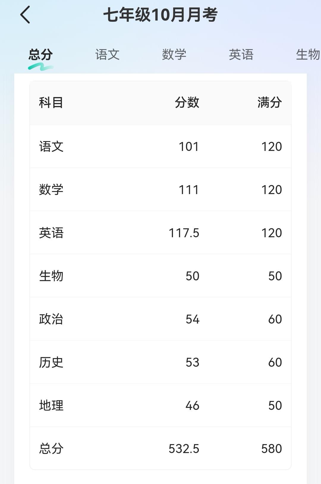 忐忑不安地等到了孩子的月考成绩,总体还不错。总分532.5分(满分580分),班一,年级排第八,维持了当初入校考试的排名。班主任老师很高兴,大大表扬了孩子。 去接孩子,孩子一见到我就自己分析了考试成绩,说这次语文没考好,才考了101分,作文就扣了十几分。以后这块得重视了,中学语文老师可不是好糊弄的,都是严格按照等级标准来评定的。[捂脸] 生物不错,考了满分,班上唯一一个。数学,说实话,也有点少,没上115,不符合我的预期。[黑线] 就这样吧,慢慢来,一步一个脚印,相信会越来越好的。月考 初中生月考 七年级月考