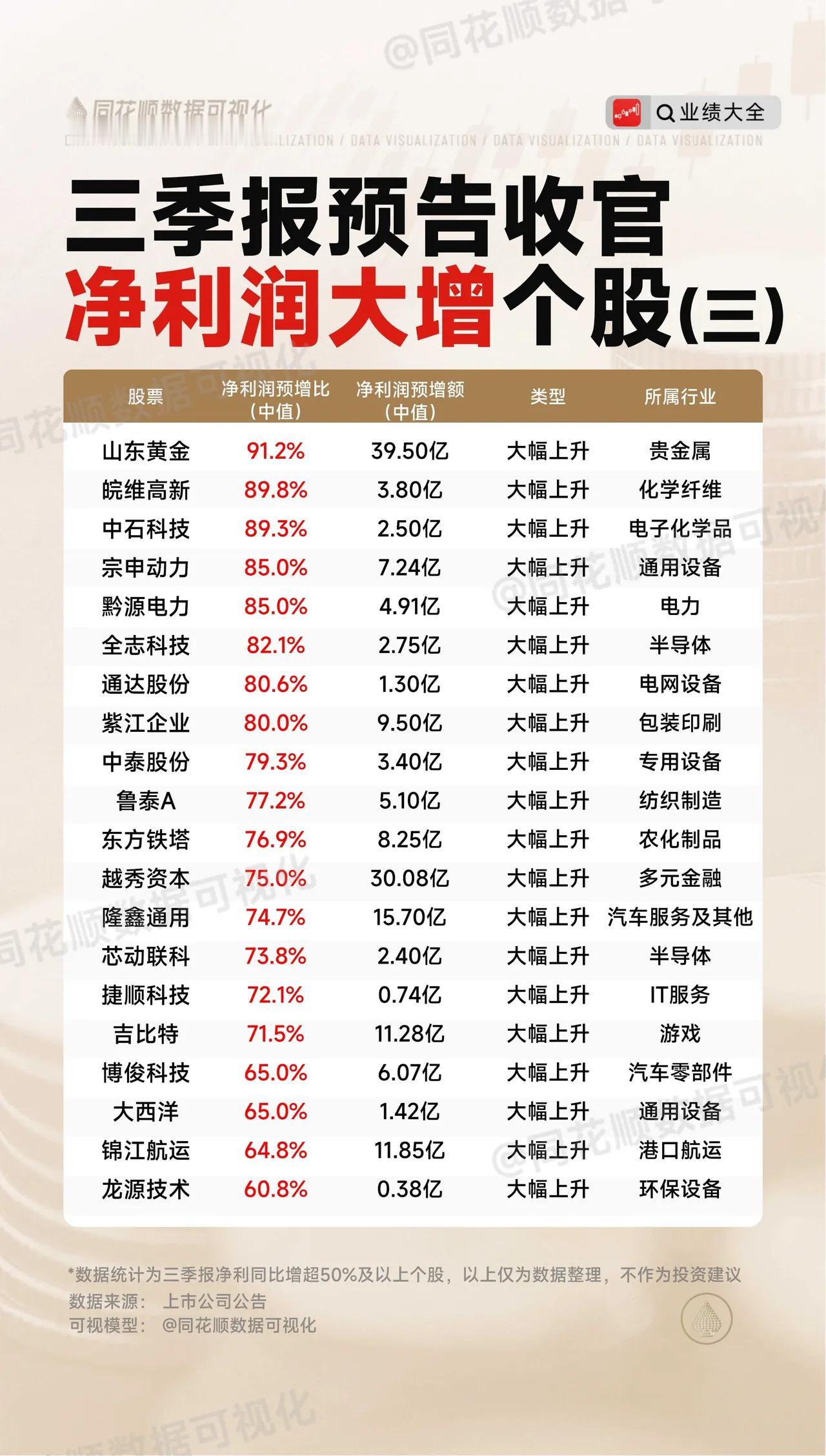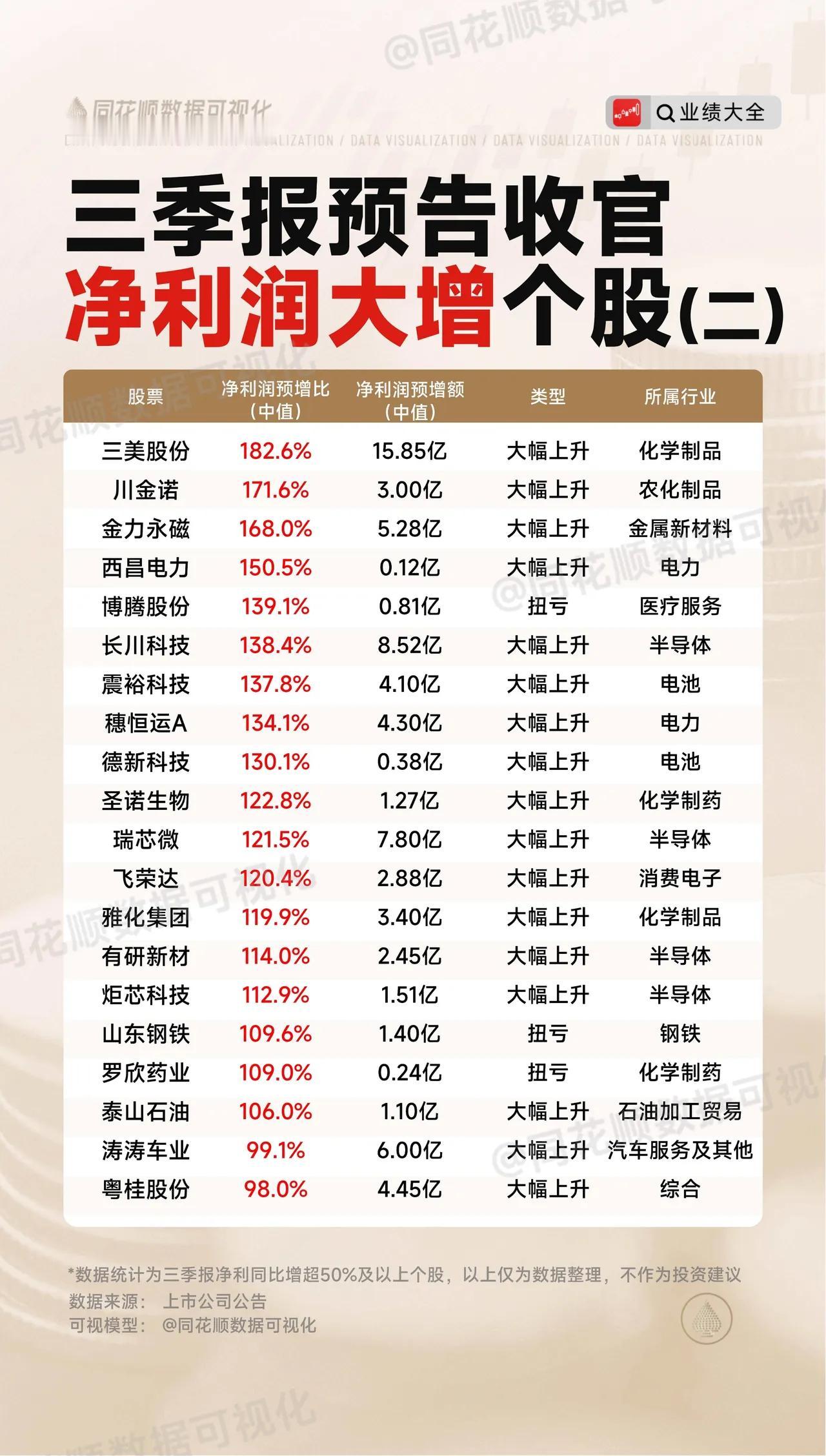 “三季报预告收官 净利润大增个股”,以下是对三季报净利润同比增幅超过50%的个股核心信息的总结: 一、整体概况 - 数据范围:所有展示个股均为三季报净利润同比增长幅度超过50%的上市公司,数据来源于上市公司公告,仅供信息参考,不构成投资建议。 - 内容结构:每组图表列出多只个股,包含股票名称、净利润预增比例(中值)、净利润预增金额(中值)、业绩类型(如“大幅上升”或“扭亏”)以及所属行业。 二、重点高增长个股亮点(按预增比例排序) 1. 预增比例最高个股 - 先达股份(农化制品):净利润预增比例高达 3009.8%(中值),预增金额约 1.93亿元,是所有展示个股中增幅最为显著的一只。 - 楚江新材(工业金属):净利润预增 2150.1%(中值),预增金额 3.65亿元,增幅位居第二。 - 英联股份(包装印刷):预增 1602.1%(中值),预增金额 0.36亿元。 - 广东明珠(钢铁):预增 964.9%(中值),预增金额 2.39亿元。 - 盛和资源(小金属):预增 739.9%(中值),预增金额高达 7.80亿元。 2. 预增金额特别突出的个股 - 新华保险(保险):虽然预增比例为 55.0%(中值),但预增金额极为可观,达到 320.54亿元。 - 北方稀土(小金属):预增 279.9%(中值),预增金额 15.40亿元。 - 芭田股份(农化制品):预增 245.5%(中值),预增金额 7.06亿元。 - 建投能源(电力):预增 231.8%(中值),预增金额 15.83亿元。 - 永和股份(化学制品):预增 218.4%(中值),预增金额 4.66亿元。 - 山东黄金(贵金属):预增 91.2%(中值),预增金额 39.50亿元。 - 越秀资本(多元金融):预增 75.0%(中值),预增金额高达 30.08亿元。 - 隆鑫通用(汽车服务及其他):预增 74.7%(中值),预增金额 15.70亿元。 - 横店东磁(光伏设备):预增 57.7%(中值),预增金额 14.60亿元。 - 东吴证券(证券):预增 57.5%(中值),预增金额 28.86亿元。 三、行业分布特征 从行业维度看,净利润大增的个股广泛分布于多个领域,其中: - 材料与化工类(如农化制品、化学制品、小金属、工业金属等)表现尤为突出,包括先达股份、楚江新材、盛和资源、北方稀土、芭田股份、利民股份等,多只个股预增比例超200%甚至3000%。 - 能源与电力:如建投能源(电力,预增231.8%)、黔源电力(电力,预增85.0%)。 - 电子设备与半导体:如全志科技(半导体,预增82.1%)、通达股份(电网设备,预增80.6%)、紫江企业(包装印刷,预增80.0%)、东山精密等细分领域企业。 - 医药与生物制品:如圣诺生物(预增122.8%)、罗欣药业(预增109.0%)。 - 消费与制造:如普利特(塑料制品,预增60.7%)、莲花控股(食品加工,预增60.5%)、吉宏股份(互联网电商,预增60.0%)。 - 金融与证券:如新华保险(保险,预增55.0%,金额巨大)、东吴证券(证券,预增57.5%)。 - 游戏与科技服务:如冰川网络(游戏,扭亏,预增207.1%)、吉比特(游戏,预增71.5%)、中科三环(金属新材料,扭亏)、芯动联科(半导体,预增73.8%)。 四、业绩类型分布 - “大幅上升”:绝大多数个股(如先达股份、楚江新材、山东黄金等)均被标注为“大幅上升”,代表净利润同比实现显著增长。 - “扭亏”:部分企业如远大智能、中科三环、冰川网络等,从亏损转为盈利,也属于业绩显著改善类型。 五、总结 本次三季报预告数据显示,众多上市公司在第三季度实现了显著的净利润增长,尤其是材料化工、能源电力、金融证券、医药生物及消费制造等行业内部分企业,不仅增幅比例惊人(最高超3000%),部分企业净利润绝对增量也非常可观(如新华保险预增超320亿、山东黄金预增近40亿)。这些数据反映出相关行业在报告期内可能受益于市场需求回暖、产品价格上涨、成本控制优化或业务结构改善等因素,具备较强的业绩弹性。