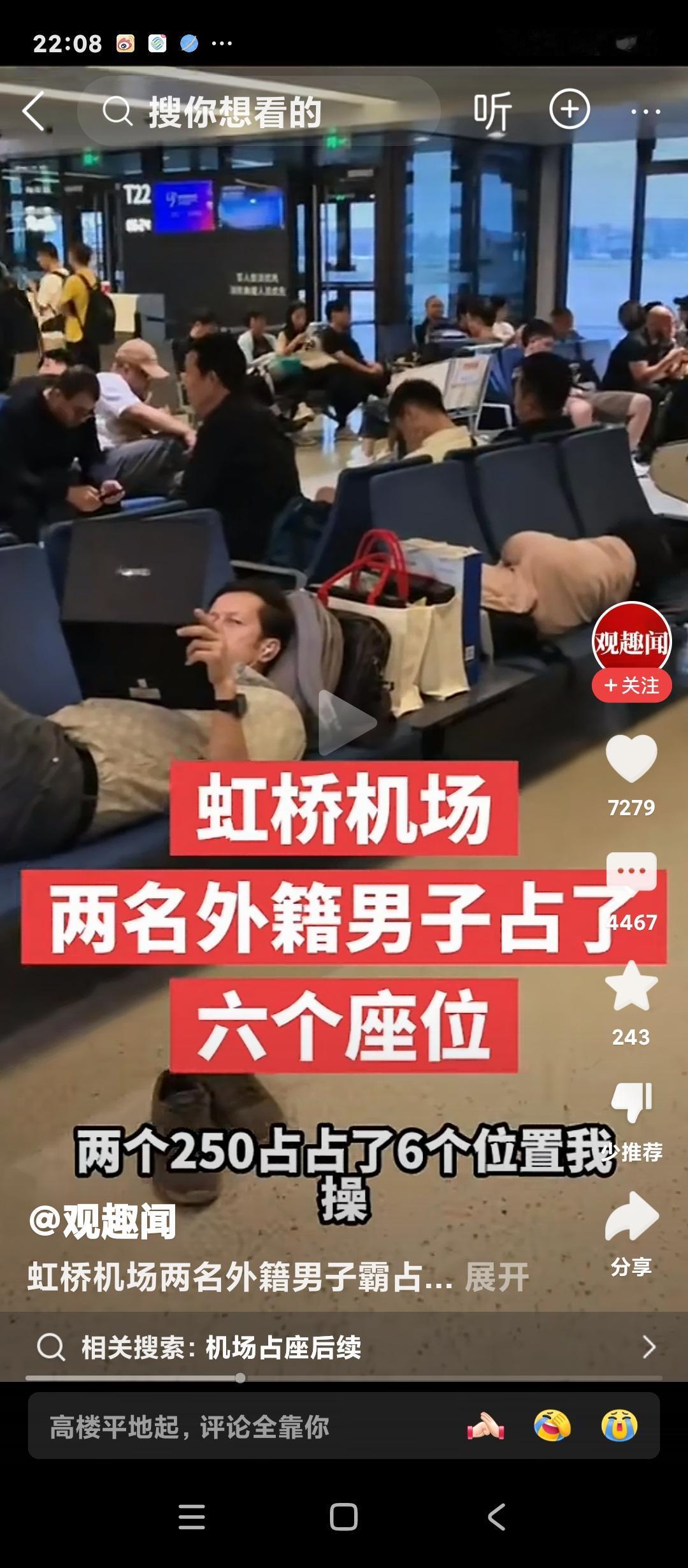 所以我们大家,千万不要太过相信去国外游了一圈,就跑回来对我们大家说,外国人素质如何如何好的,外国道路一尘不染的事。 上海虹桥国际机场发生的两名外国男子脱鞋躺占6个座位事件引发了广泛热议。 视频中,他们每人霸占三个座位,即便有人劝阻也无济于事。 此事曝光后,网友们议论纷纷,不少人分享自己在机场同样遇到过占座现象,认为这与是否为外国人并无关联。 机场工作人员回应称会加强巡查力度,并强调外国人不享有特权,这纯粹是个人素质问题。 然而,部分网友却紧咬“外籍”身份不放,言辞颇为尖锐。 实际上,这一事件的核心在于公共礼仪的遵守和规则的执行。 使用公共资源时,每个人都应把握好边界,不能只图自己方便而忽视他人权益,大家都需自觉维护公共秩序。 有一个问题想问,如果是我们中国人这样,大家还会这样客气的对待吗? 还会让他躺让,让他睡得那么舒服吗? 声明:个人观点,非喜勿喷! (图片来自网络,涉侵请联系删除)
