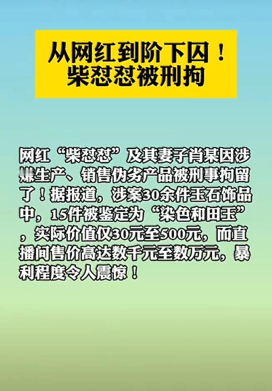 网红柴怼怼被抓!还记得那个骂胖东来“卖智商税”的网红柴怼怼吗?这回彻底栽了!10月17日消息,他和妻子因涉嫌生产、销售伪劣产品被正式逮捕,网友看完全喊“该!”。 这事儿得倒回去说,之前柴怼怼靠着骂胖东来吸粉造势,把自己包装成“正义博主”,转头就在直播间卖玉石。可消费者花16800元买的“和田玉籽料”,官方鉴定才值367元,售价是实际价值的45倍还多!有阿姨花近4万买了12件饰品,鉴定总价才3509元,更离谱的是不少“玉石”直接被鉴定机构拒收,说“没鉴定的意义”,就是堆破烂石头 。 早在7月,他因无凭无据抹黑胖东来,账号就被网信部门依法关停了 。本以为能收敛,没想到暗地里还在卖伪劣玉石,直到9月被警方刑拘,如今正式逮捕,算是给被骗的消费者一个交代。有花了10万没追回8万的谭女士说,终于能回归正常生活了,不用再揪着心维权了。 这事儿也算给所有人敲了警钟:那些打着“揭秘”“打假”旗号博眼球的博主,说不定自己才是最大的“坑”。直播间买贵重物品千万别上头,记住三点不吃亏:① 先查商家资质,别信“独家”“捡漏”;② 要求出具权威鉴定证书,而且得能官网核验;③ 保留聊天和付款记录,有问题及时找12315。 靠诋毁别人引流,用假货收割粉丝,这种突破底线的操作,迟早要被法律收拾。毕竟网络不是法外之地,耍小聪明坑人的,终究躲不过制裁。 网红带货翻车现场 网络不是法外之地 ,为警方的快查快办点赞!你在直播间踩过哪些坑?有啥避坑妙招,评论区分享出来,帮大家避避雷!