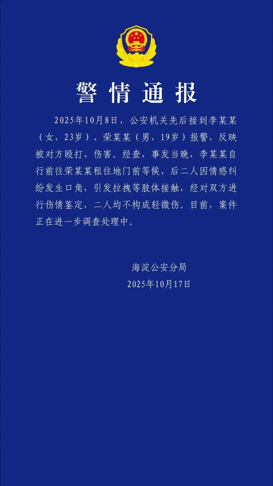 【警方通报荣梓杉李禹熹打人纠纷】警方通报荣梓杉李禹熹纠纷细节 划重点!警方通报的几点:①两人先后都报警,说被对方殴打伤害;②女方到男方住所等候;③两人因情感纠纷发生口角,还互相拉拽。④均不构成轻微伤。⑤案件还在进一步调查。