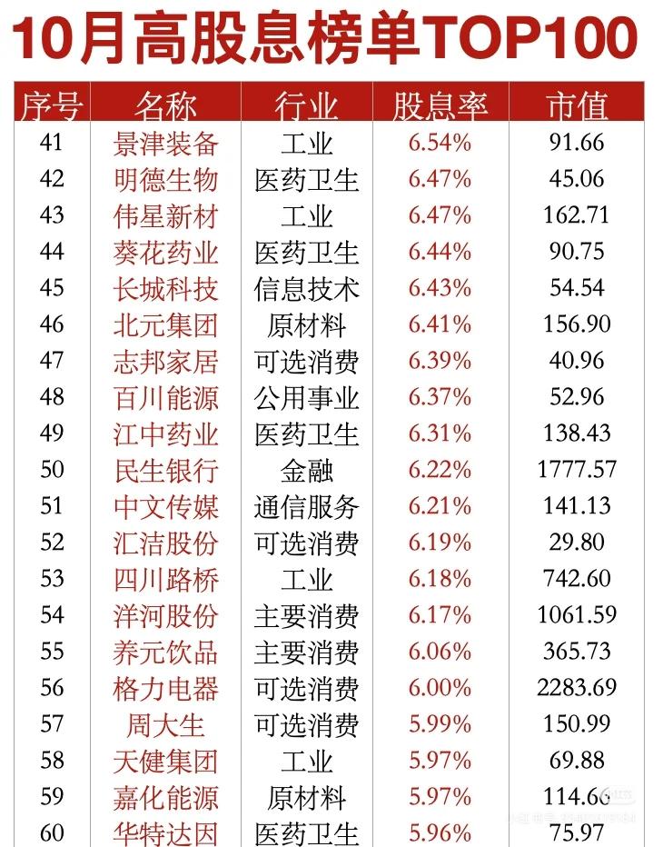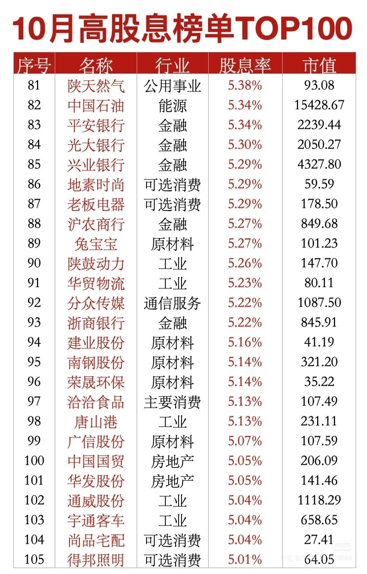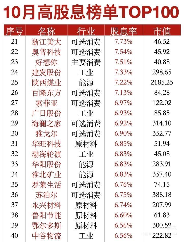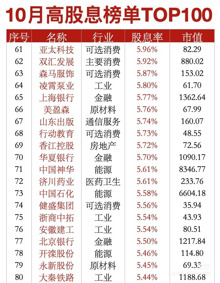 “10月高股息榜单TOP100” 一、整体榜单结构 榜单按股息率从高到低排序,共100家公司,分为5个部分展示。 二、高股息公司行业分布广泛 这些高股息公司覆盖了多个行业,主要包括: - 能源(如:广汇能源、中远海控、陕西煤业、中国神华、中国石化、中国石油) - 工业(如:建发股份、海澜之家、伟星新材、格力电器、大秦铁路、北京银行) - 主要消费 / 可选消费(如:荣安地产、百隆东方、洋河股份、双汇发展、老板电器、地素时尚) - 金融(如:民生银行、兴业银行、平安银行、光大银行、北京银行、上海银行) - 医药卫生(如:明德生物、葵花药业、江中药业、济川药业) - 原材料、公用事业、通信服务、房地产等 三、股息率排名靠前的公司(前20名重点) 1. 广汇能源:股息率 13.52%(最高),市值 338.14 2. 中远海控:股息率 13.06%,市值 2321.91(市值最高之一) 3. 冀中能源:股息率 12.97% 4. 恒源煤电:股息率 10.82% 5. 荣安地产:股息率 10.36% 6. 潞安环能:股息率 10.15% 7. 立霸股份:股息率 10.14% 8. 山西焦煤:股息率 9.95% 9. 蓝天燃气:股息率 9.53% 10. 兖矿能源:股息率 9.51% 11. 平煤股份:股息率 9.43% 12. 达安基因:股息率 9.25% 13. 山煤国际:股息率 9.24% 14. 富森美:股息率 8.96% 15. 富安娜:股息率 8.68% 16. 元祖股份:股息率 8.16% 17. 厦门国贸:股息率 8.15% 18. 兰花科创:股息率 8.15% 19. 东方雨虹:股息率 8.01% 20. 江山欧派:股息率 7.96% 👉 前20名中,能源类企业占据多数,且股息率普遍在8%以上,最高达到13.52%。 四、部分高市值且股息率较高的代表性公司 - 中国石油(能源,股息率 5.34%,市值 15428.67 —— 市值最高) - 中国神华(能源,股息率 5.61%,市值 8346.77) - 中国石化(能源,股息率 5.58%,市值 6604.18) - 民生银行(金融,股息率 6.22%,市值 1777.57) - 格力电器(可选消费,股息率 6.00%,市值 2283.69) - 陕西煤业(能源,股息率 7.22%,市值 2185.25) - 中远海控(工业/运输,股息率 13.06%,市值 2321.91) - 广汇能源(能源,股息率 13.52%,市值 338.14) 五、股息率区间分布简要说明 - 前1–20名:股息率基本在 7.7% ~ 13.52% 区间,属于极高股息范畴。 - 21–40名:股息率主要集中在 6.56% ~ 7.73% - 41–60名:股息率大致在 5.96% ~ 6.54% - 61–100名:股息率大多在 5.0% ~ 6.0% 之间,最低为 5.01%(得邦照明),最高为 6.0%(格力电器) 六、榜单特点总结 1. 能源行业强势霸榜:尤其是煤炭(如广汇能源、冀中能源、恒源煤电)、石油(中国石油、中国石化)、天然气(陕天然气)相关企业,不仅股息率高,部分公司市值也非常大。 2. 高股息与高市值并存:如中国石油(市值15428.67)、中国神华(8346.77)、中远海控(2321.91)等,既有稳定高分红,又有较大市场价值。 3. 金融、工业、消费类企业表现稳定:如民生银行、格力电器、海澜之家、洋河股份等,股息率多在 5%~6% 区间,适合稳健型投资。 4. 榜单整体偏向稳健、成熟型企业:高股息通常意味着公司具备稳定的盈利和现金流,多属于传统行业中的龙头企业。