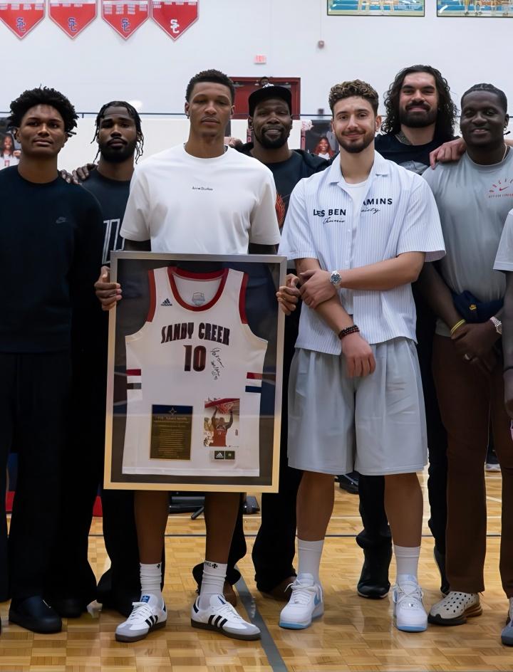 火箭队这张合影,太离谱了! 杜兰特以往在任何球队里,从来都是大高个的代表,一个队里也就有那么一两个比他高的,结果到了火箭队,居然合影显矮了... 排除掉亚当斯耍赖垫脚之外,火箭其他人的身高是真的吓人,这队伍现在整体的高度绝对是联盟独一档,加上大臂展,在防守端基本就把三分线内一步的空间挤满了,给对手的进攻造成的麻烦太大太恐怖。 更离谱的是,这帮人里,就杜兰特一个老将,其他的后卫线和锋线,脚步移动都很快,要是乌度卡给整点军事化训练,这几个球员就真的要变成“悍匪”了,谁想突破进内线拿2分,都得挨一巴掌...