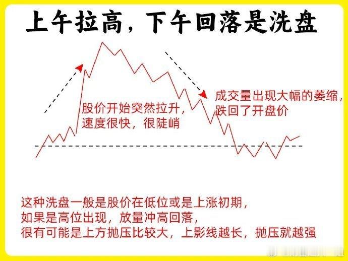 在分时图中,早上开盘以后,股价开始突然拉升,速度很快,很陡峭,到了下午,股价开始下跌,成交量出现大幅的萎缩,跌回了开盘价,一般是主力的洗盘,当然了,这种洗盘一般是股价在低位或是上涨初期,如果是高位出现,放量冲高回落,很有可能是上方抛压比较大,上影线越长,抛压就越强